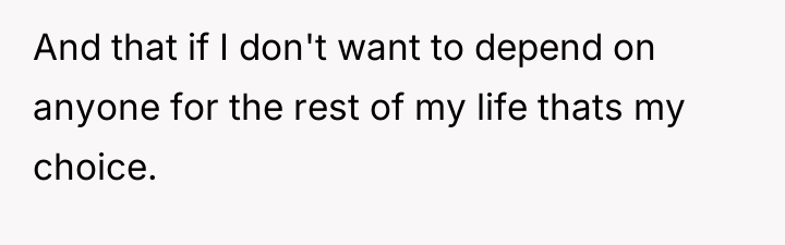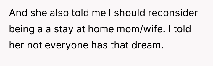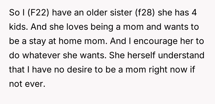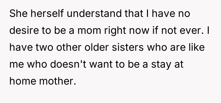 In my opinion, this situation highlights the importance of respecting individual choices and the diversity of life goals. Not everyone wants the same things, and pressuring someone to conform to traditional roles can be harmful and damaging to relationships. OP's decision to prioritize her own well-being and boundaries is commendable, and it serves as a reminder that support and understanding should always come first in any form of relationship.