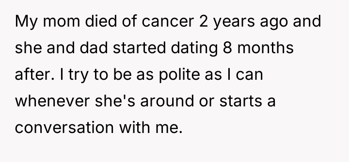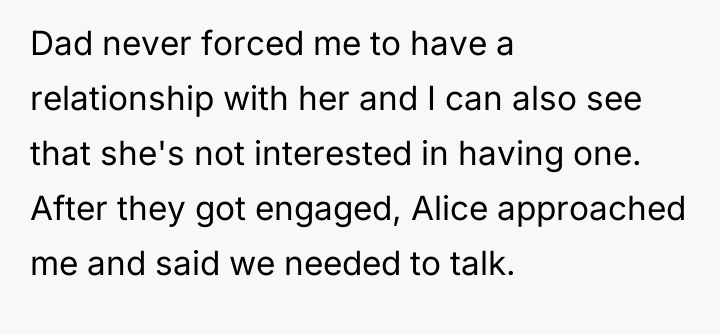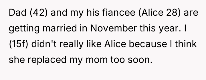 Grieving the loss of her mother, a fifteen-year-old girl struggles to accept her father’s new fiancée, Alice, who she feels stepped into her mother’s place too quickly. The raw ache of loss intertwines with the fragile threads of a family trying to redefine itself, leaving the girl caught between politeness and silent resistance.