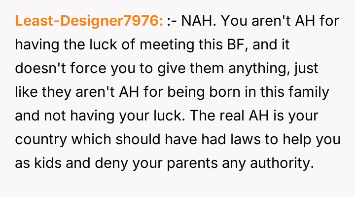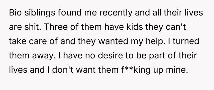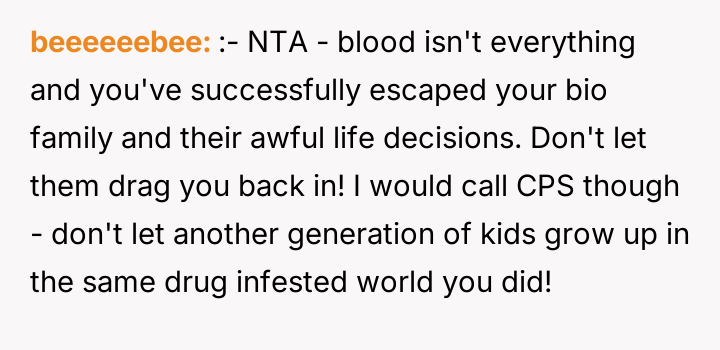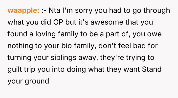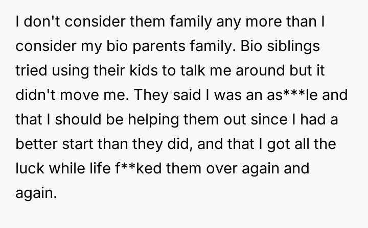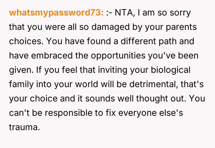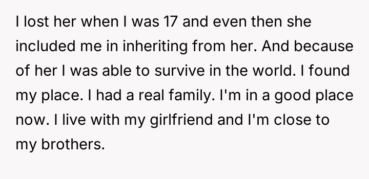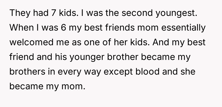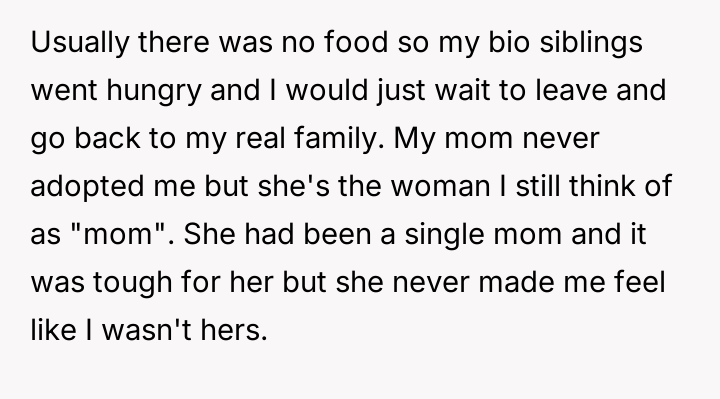 After reading through the Reddit comments, it's clear that many readers deeply empathize with the OP's story, recognizing the profound impact a loving and supportive family can have, regardless of biology. People praised the resilience shown by the OP and the unconditional love from the woman who became his true mother figure, highlighting how family is defined more by care and commitment than by blood alone. Several commenters shared similar experiences, reinforcing the importance of chosen family and the strength it can provide in overcoming adversity.