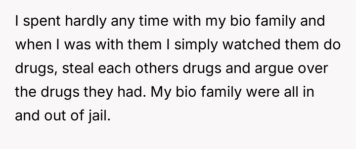 In my opinion, this story is a powerful reminder that the people who truly shape us are those who stand by us in our darkest times. The OP's journey from a chaotic biological family to a nurturing, loving home illustrates the transformative power of compassion and acceptance. It's heartening to see that despite such a difficult start, the OP found belonging and love, which ultimately helped him build a foundation for a better future.