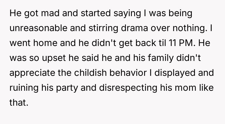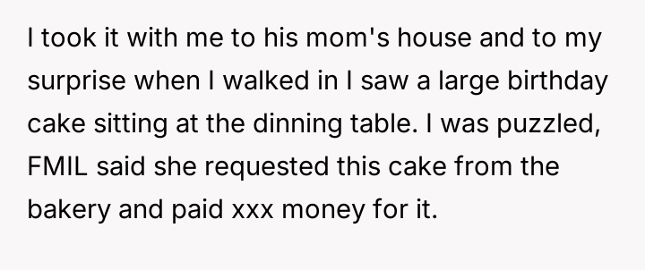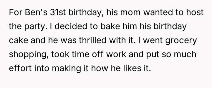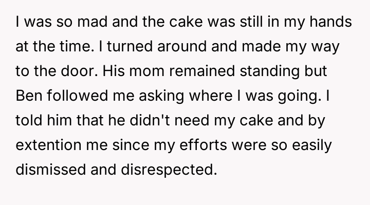 red velvet cake beautifully decorated on the table – exactly the kind I had baked for Ben. His mom had already prepared a cake, which she proudly displayed as the centerpiece of the celebration. Despite my efforts, she hadn't mentioned anything about my cake, and it seemed like she intended for hers to be the one everyone ate. Feeling a mix of disappointment and frustration, I quietly placed my cake on the side and watched as the party unfolded. Ben seemed happy, but I couldn't shake off the feeling that my gesture was overshadowed, if not completely ignored.