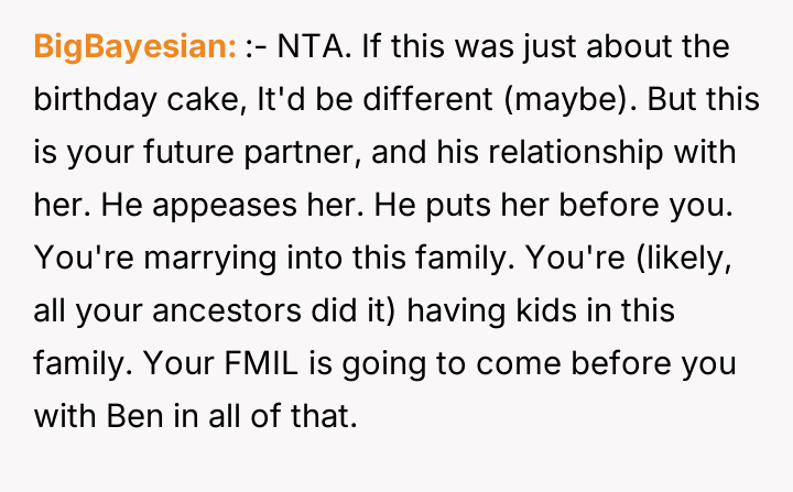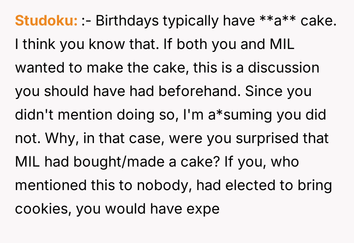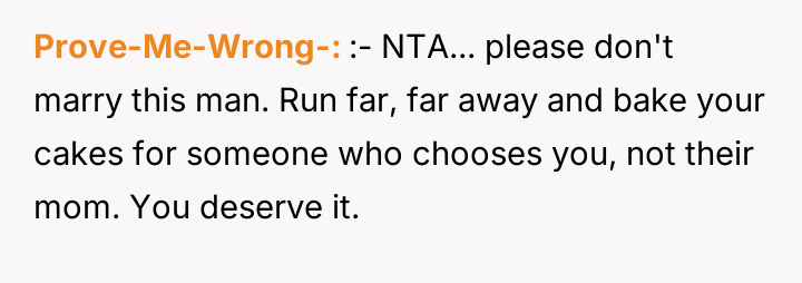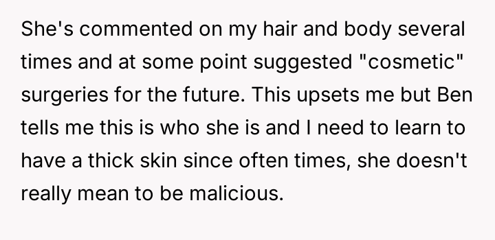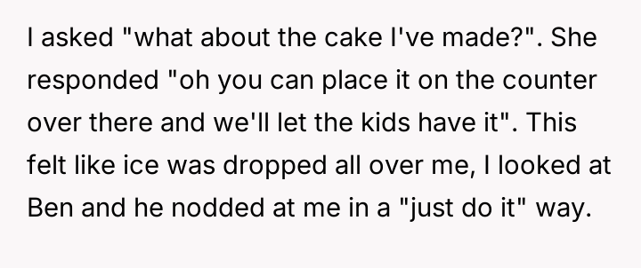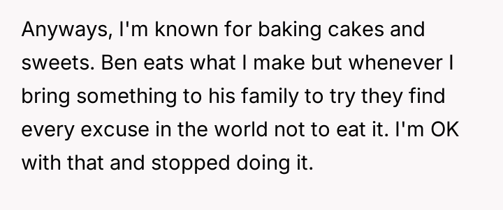 Reading through Reddit comments, many users sympathized with the original poster, noting that the mother-in-law's behavior was dismissive and unkind, especially since cooking and baking are often heartfelt expressions of love. Some suggested that the poster continue setting boundaries and prioritize her emotional well-being, while others emphasized the importance of Ben supporting her more actively. Personally, I think it’s crucial for partners to stand up for each other in situations like this, and for the poster to recognize her own worth beyond the mother-in-law’s critiques. It’s a tough dynamic, but respect and appreciation should never be optional in family relationships.