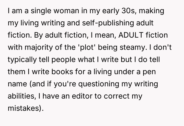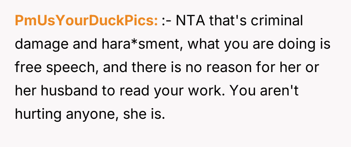 After reading through the Reddit comments, it's clear that many readers sympathize with the author's discomfort and appreciate her setting boundaries with an overstepping neighbor. The majority agree that her choice to keep her work private is entirely valid and that Roger's behavior was inappropriate, especially given their polite but distant relationship. Commenters also praised her for handling the situation maturely by avoiding confrontation and focusing on her own comfort.