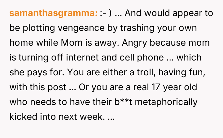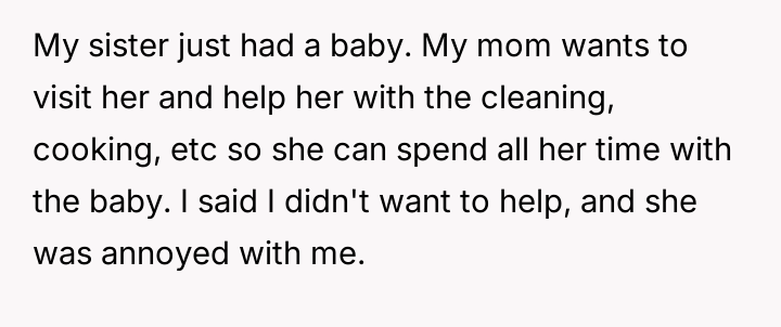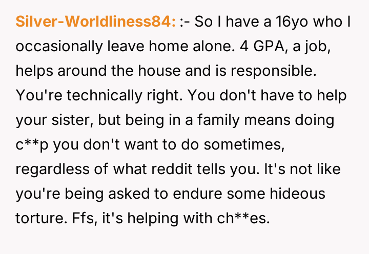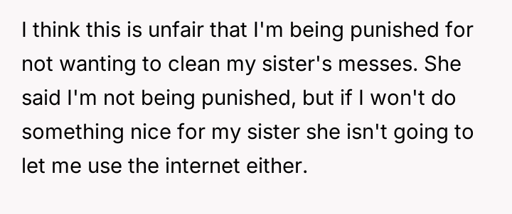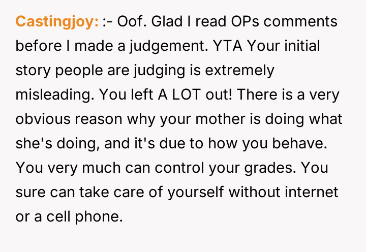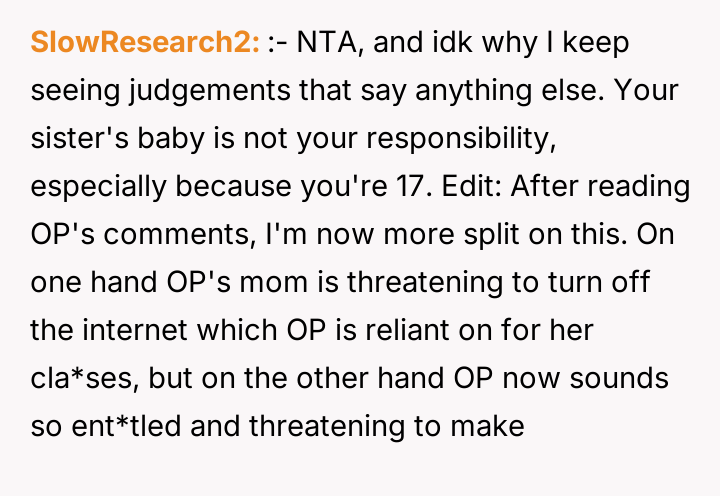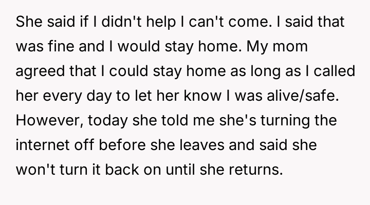In my opinion, while it’s understandable that the mother wants to support her daughter and expects family members to pitch in, the method of cutting off internet and phone access feels excessive and punitive. Healthy family dynamics rely on mutual respect and clear communication, not control and ultimatums. Hopefully, with some honest conversations, they can find a middle ground where the new mom gets help, and the poster maintains their independence without feeling punished.