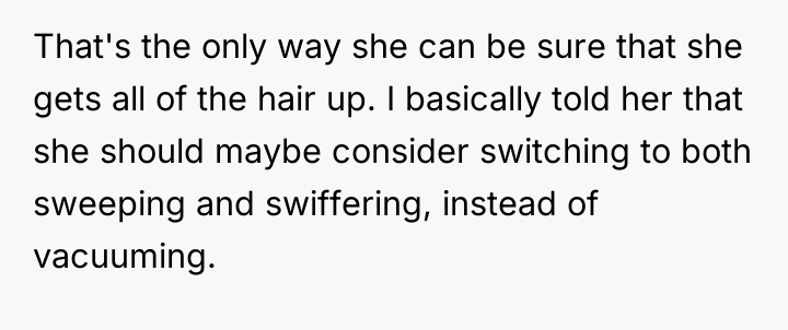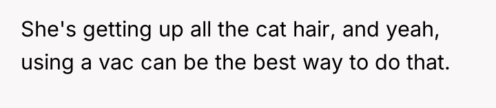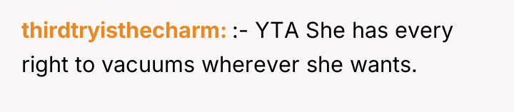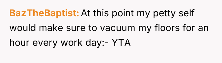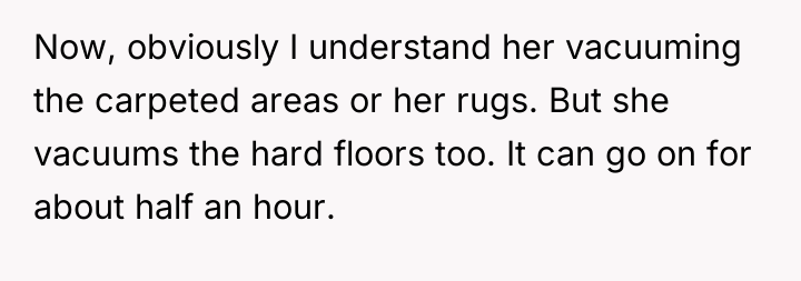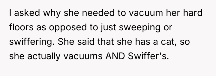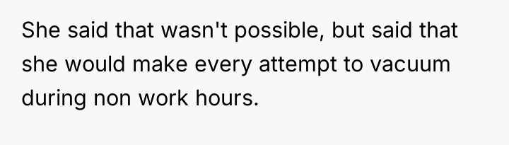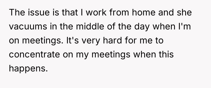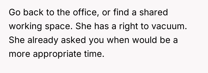 After reading through the Reddit comments, it seems many people sympathize with the original poster's predicament. Working from home requires a quiet environment, and unexpected noise like vacuuming during meetings can be challenging. Most commenters appreciated that the neighbor was understanding and willing to adjust her schedule after being approached politely. Some suggested practical compromises, like using quieter vacuum models or scheduling cleaning times around work hours, which could benefit both parties.