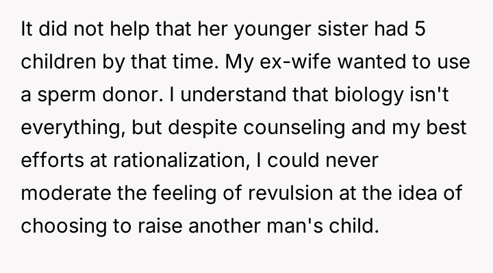 After reading through the Reddit comments, it’s clear that many empathize with the pain and complexity of this situation. The struggle with infertility and the emotional toll it takes on both partners is deeply challenging, and the feelings of revulsion toward a sperm donor, while difficult to understand for some, are valid and personal. People also acknowledge the heartbreak of the ex-wife’s depression and the couple’s eventual separation, underscoring how such issues can strain even the strongest relationships.