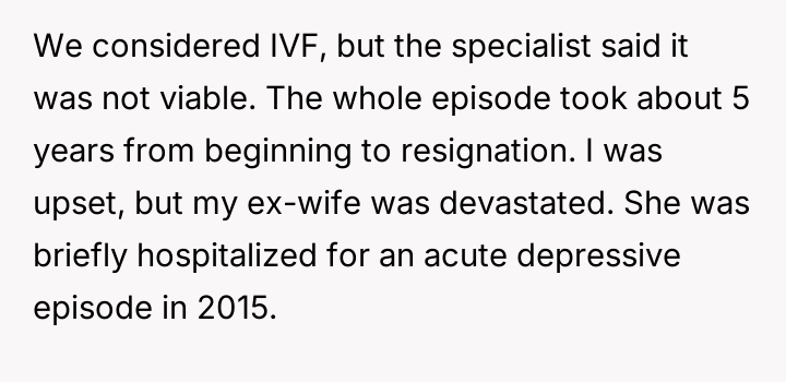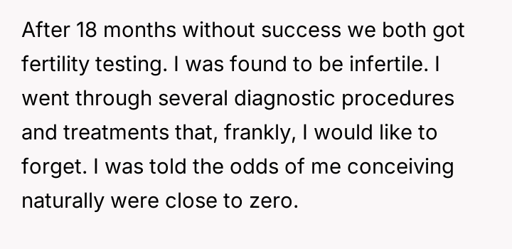 In my opinion, this story highlights the profound impact infertility can have beyond just the physical inability to conceive—it touches on identity, expectations, and intimacy. While the path they took didn’t lead to the family they wanted, their experiences remind us of the importance of empathy and communication in navigating such sensitive matters. It also emphasizes that sometimes love, no matter how strong, isn’t enough to overcome certain fundamental differences in coping and desires.