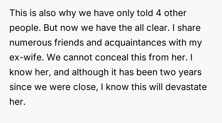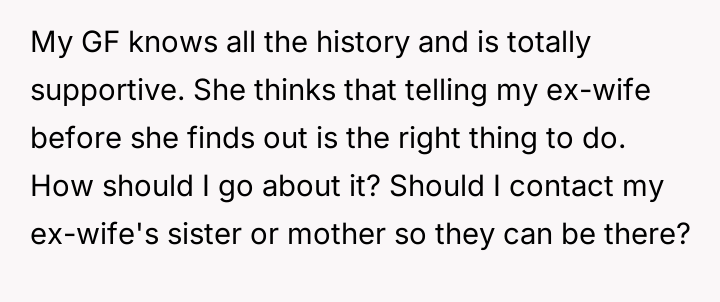 My ex-Wife (F38) and I (M38) divorced because I was infertile and unwilling to use a sperm donor. How should I tell her that my GF (F24) is pregnant?
