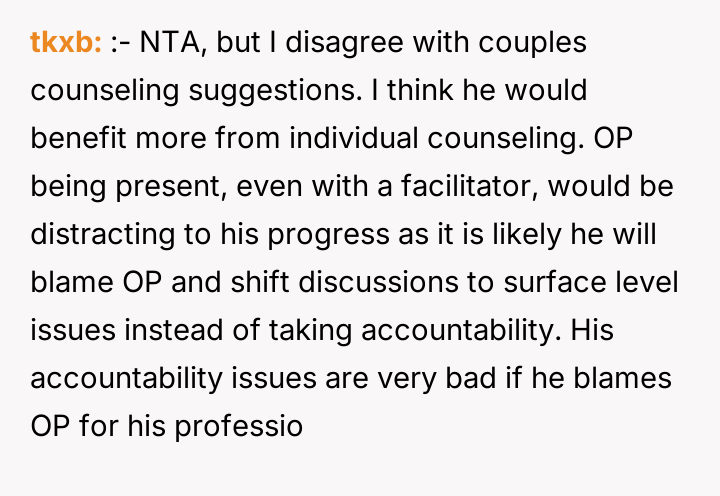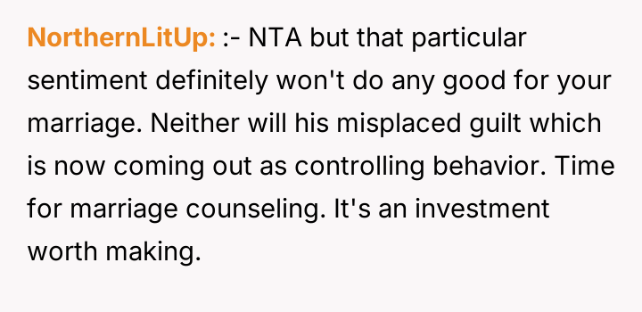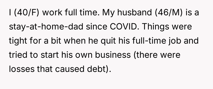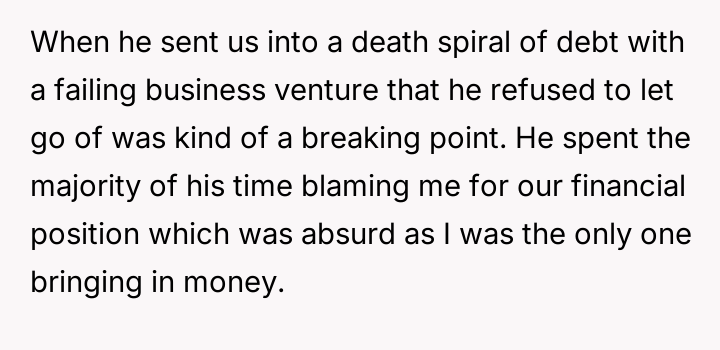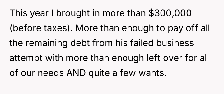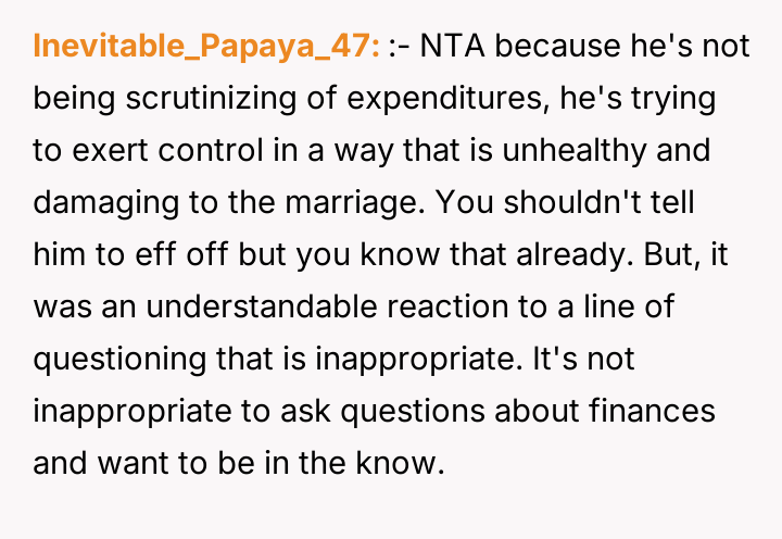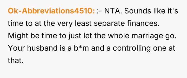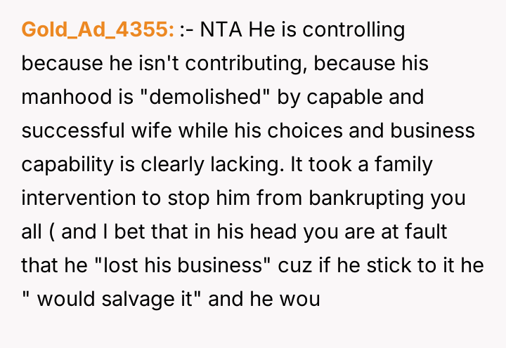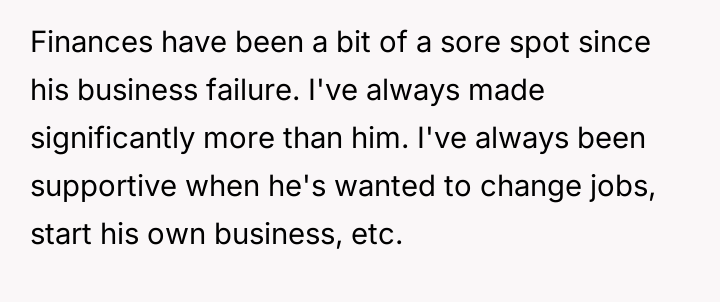 Reading through the Reddit comments on this story, many users expressed sympathy for the wife’s situation, acknowledging the strain of being the sole breadwinner while managing the stress of her husband’s failed business and controlling behavior over finances. Commenters often highlighted the importance of clear communication and mutual respect in a partnership, especially when facing financial difficulties. Several suggested that the husband’s refusal to accept responsibility and his controlling nature were red flags that needed to be addressed for the marriage to heal.