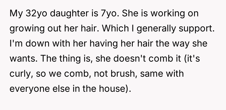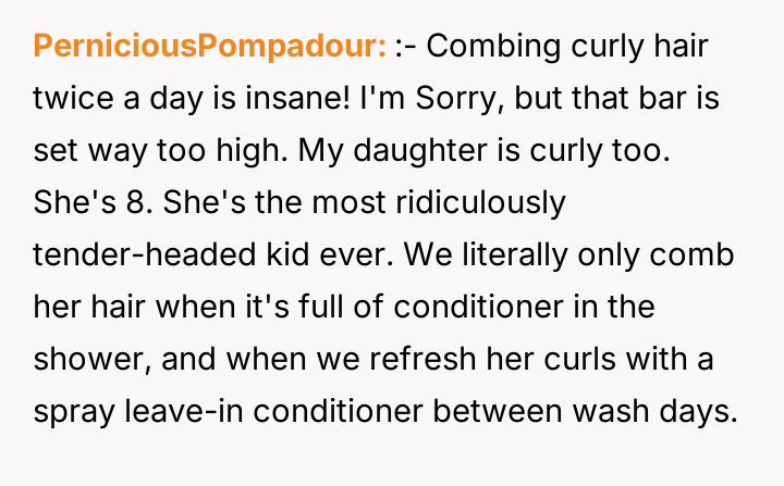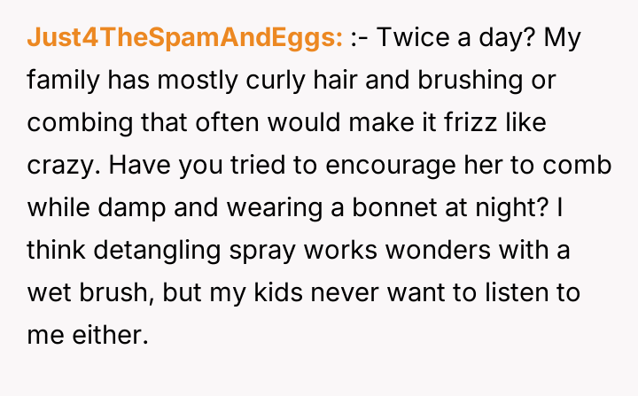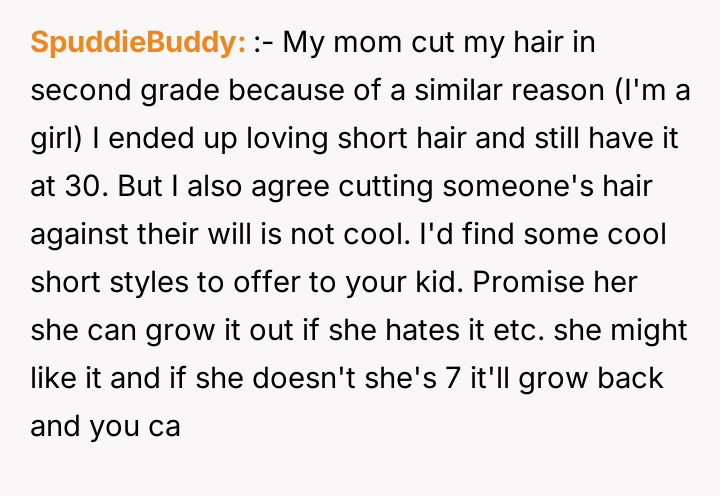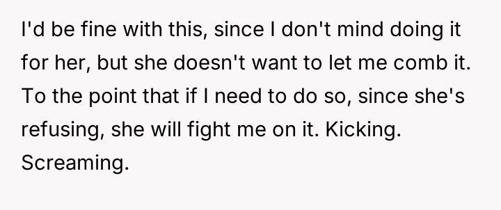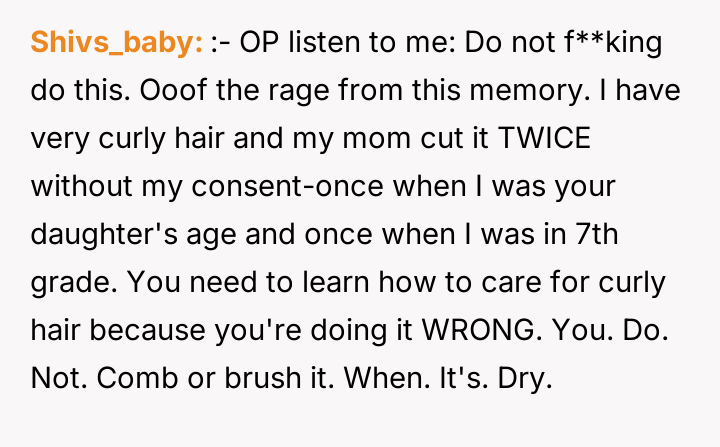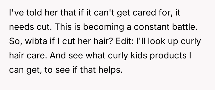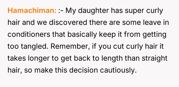 After reading through the Reddit comments, it's clear that many people empathize with the parent's frustration but also recognize the challenges of managing a child's curly hair, especially when the child resists care routines. Several commenters suggested incorporating fun activities or rewards to encourage cooperation, while others emphasized the importance of patience and gentle communication. Most agreed that outright cutting the hair as a punishment might damage trust and could be avoided if possible.