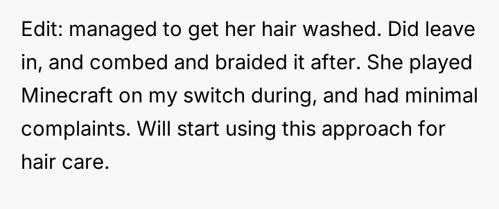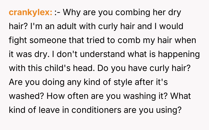 In my opinion, the parent's decision to learn more about curly hair care and try different products is a positive step forward. Building a hair care routine that feels comfortable and enjoyable for the child may reduce resistance over time. While the temptation to cut the hair to avoid the daily struggle is understandable, fostering cooperation through empathy and creativity will likely lead to a healthier relationship with both hair care and the child herself.