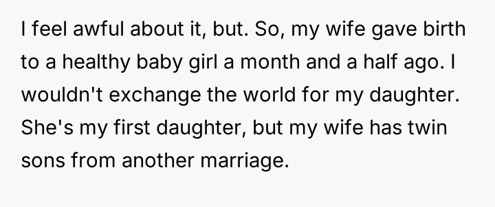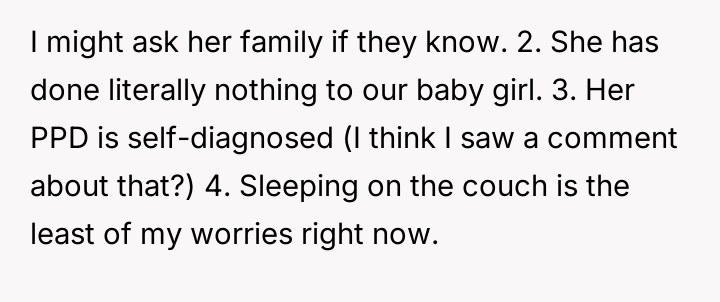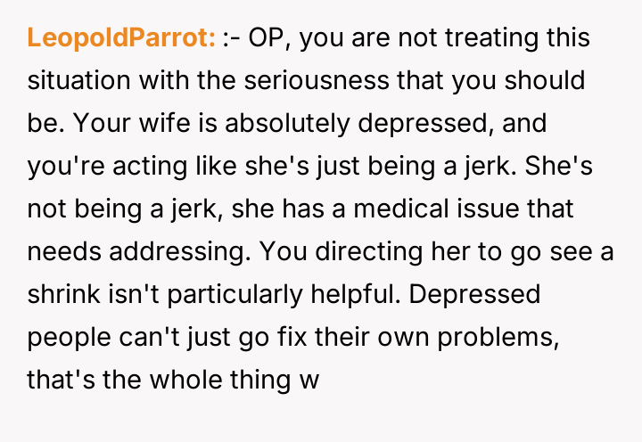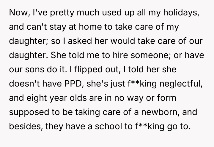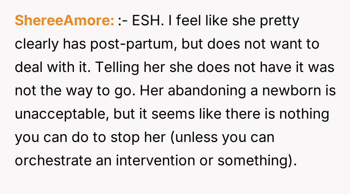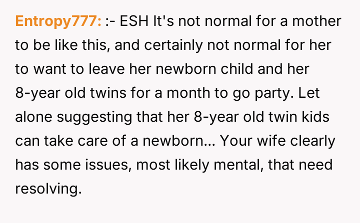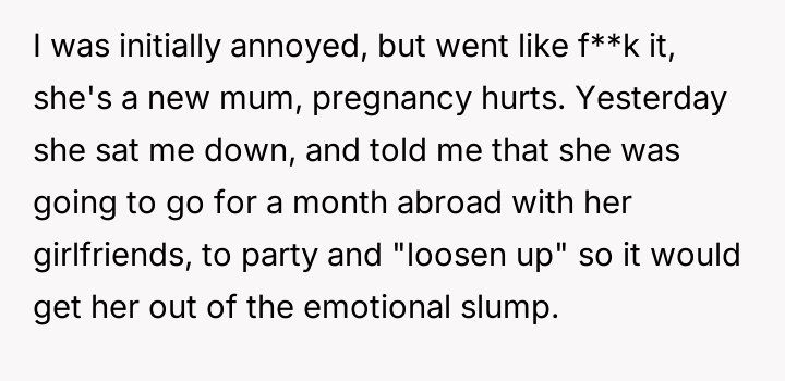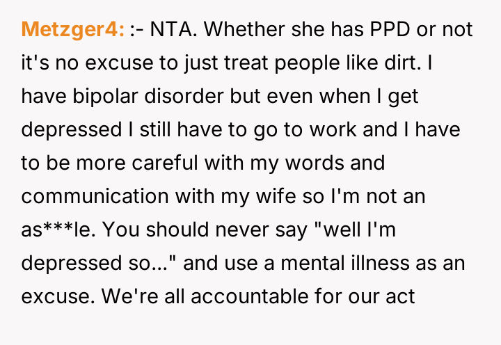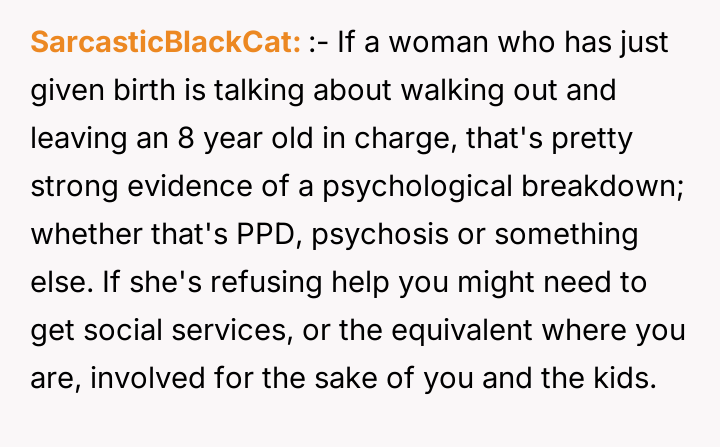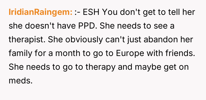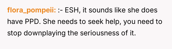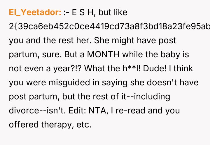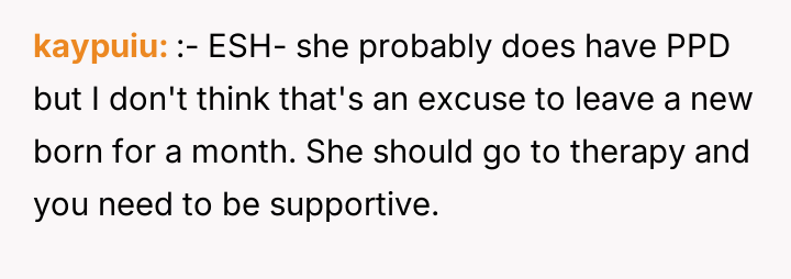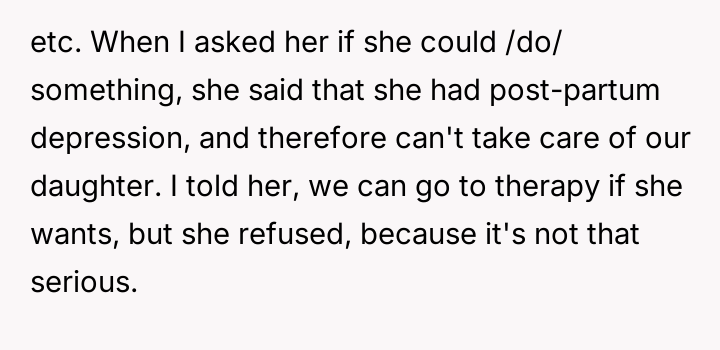 Reading through the Reddit comments, it's clear that many people empathize with the husband's difficult position. There's a strong consensus that postpartum depression is a serious condition that requires professional help, and while the wife's feelings are valid, her decision to leave the family during such a critical time comes across as neglectful to many readers. Several commenters suggested that the couple needs to communicate better and prioritize therapy together to support both the wife and the family unit.
