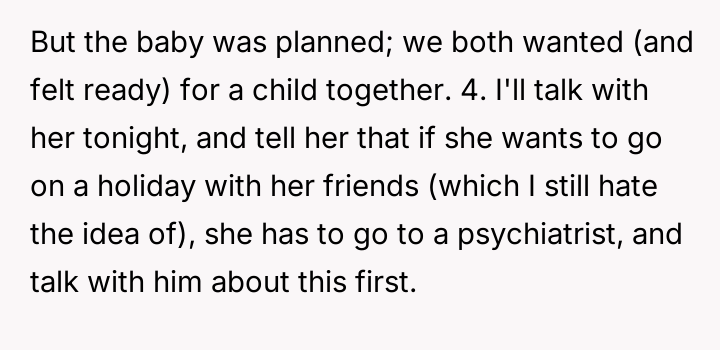 From an outside perspective, this story highlights the complex nature of mental health and family dynamics after childbirth. While taking care of a newborn is incredibly demanding, the wife's refusal to seek help and her plan to leave for a month complicate the situation further. Ultimately, it seems crucial that both partners find a way to address the emotional challenges head-on, whether through therapy or support networks, to ensure the well-being of the child and their relationship.
