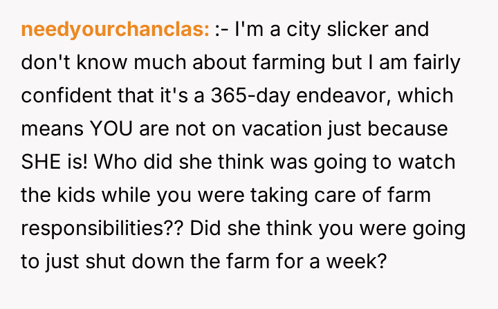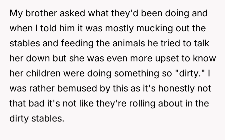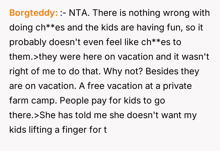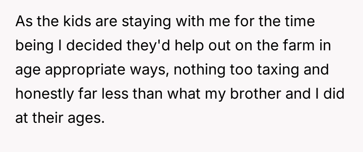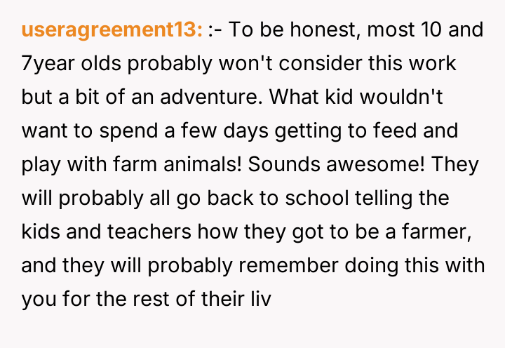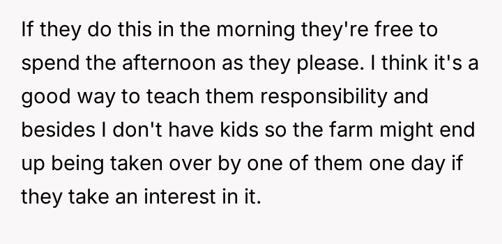 After reading through the Reddit comments, it’s clear that many people appreciated the original poster’s approach to involving the kids in farm chores in a way that is both educational and manageable for their ages. Commenters generally saw the value in teaching responsibility and the importance of contributing to family duties, especially in a farm setting where teamwork is essential. Some even noted that the poster was considerate in balancing work and play, ensuring the children still had free time to enjoy their holidays.