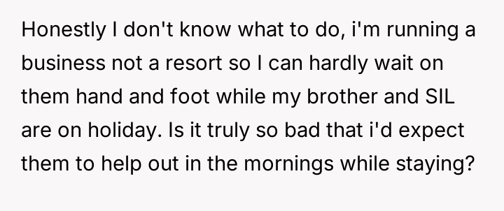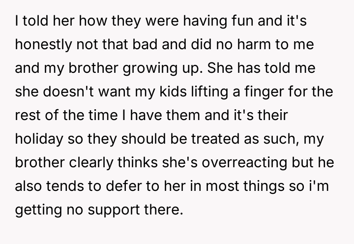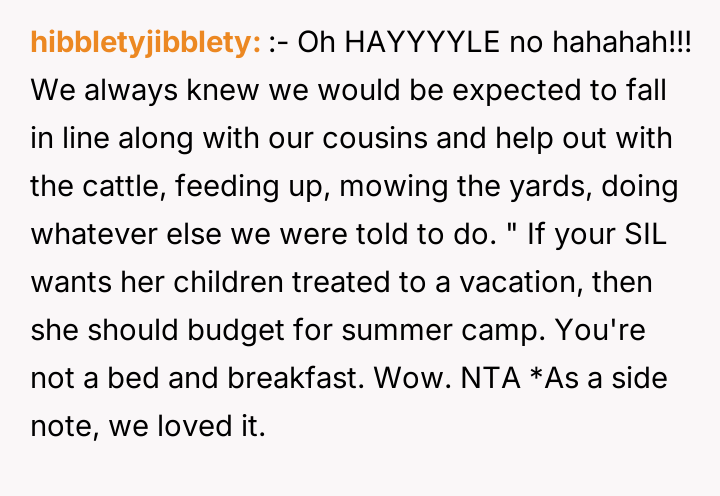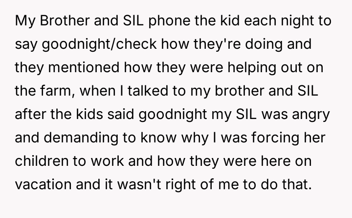 However, a few commenters expressed concern about whether the brother and sister-in-law were fully on board with the arrangement, as they might feel the chores were too demanding or not appropriate for their children. Overall, the consensus seemed to be that communication between all parties is key to making this a positive experience. In the end, the story highlights the challenges and rewards of passing down family traditions while respecting the needs and boundaries of everyone involved.