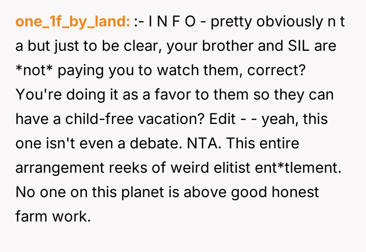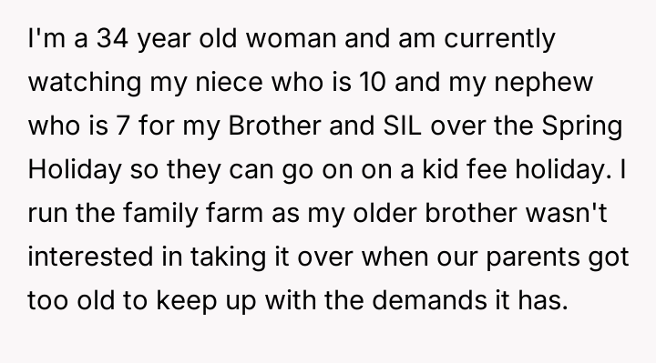 AITA for expecting my niece and nephew to help out on the farm while I watch them?