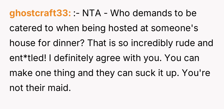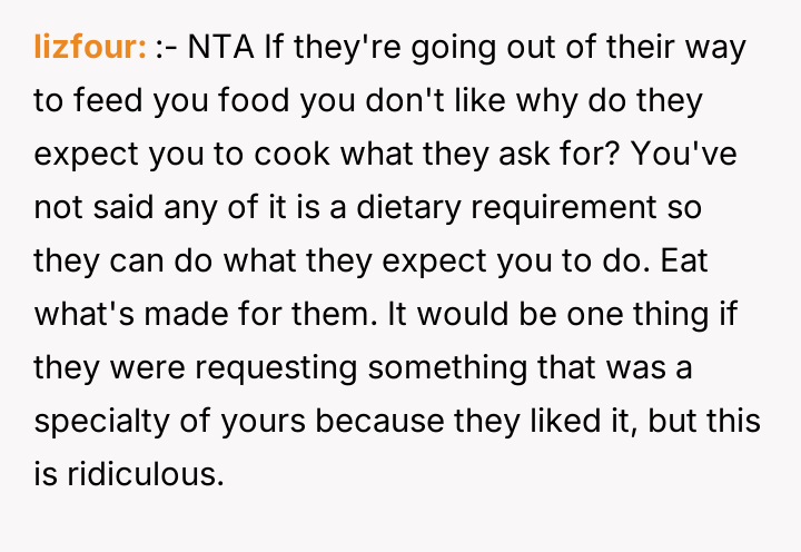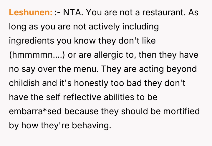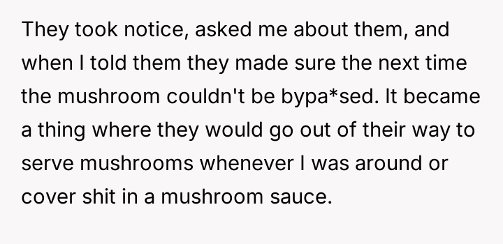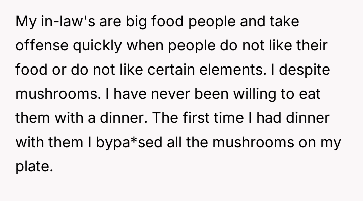 After reading through the Reddit comments on this story, it's clear that many readers sympathize with the original poster’s struggle. The in-laws' insistence on forcing mushrooms and their refusal to respect personal preferences is seen as unreasonable and disrespectful. Several commenters suggest that boundaries are important in family dynamics, especially when it comes to something as simple as food, which should be a source of enjoyment rather than conflict. The OP's decision to cook what they want and stop catering to the in-laws' demands is widely viewed as a healthy assertion of their own needs.