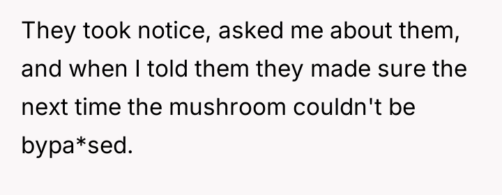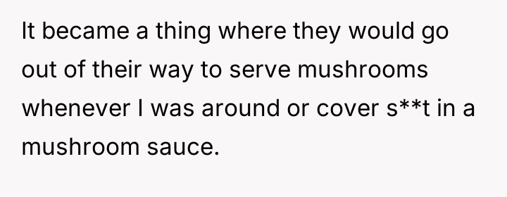 What began as a small act of avoiding mushrooms on her plate soon spiraled into a relentless campaign by her in-laws to force their tastes upon her, testing her patience and resolve. In the end, she chooses her own voice and menu, refusing to be a pawn in their game of culinary control.