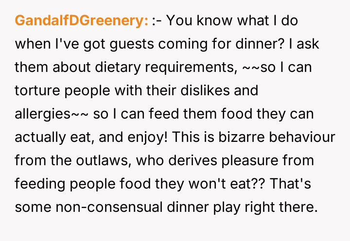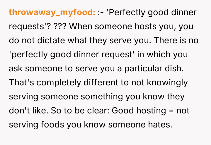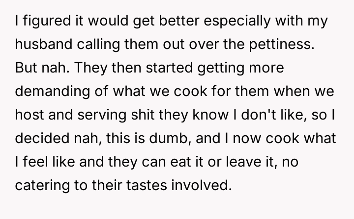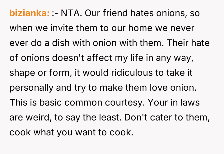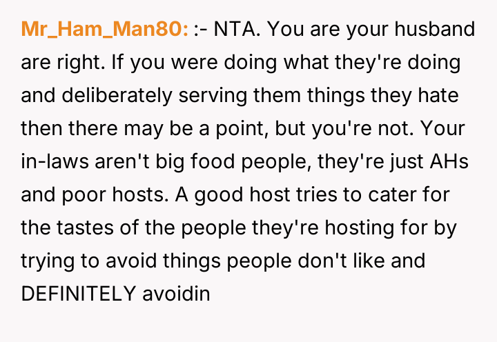 In conclusion, this story highlights how small issues like food preferences can become symbolic battlegrounds for control and respect within families. While in-laws want to share their love of food, it’s essential to recognize and honor individual dislikes to maintain harmony. The OP’s choice to prioritize their own comfort and stop engaging in the power struggle appears to be the best way forward, and many readers hope the in-laws will eventually come around to respecting boundaries without turning dinner into a contest.