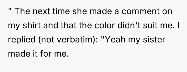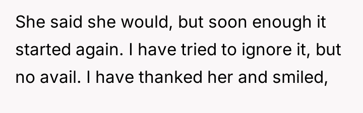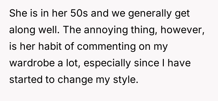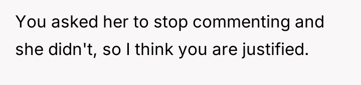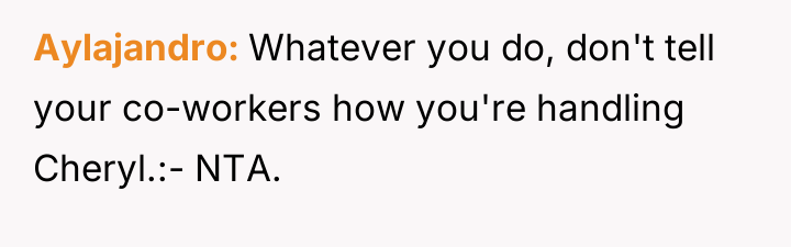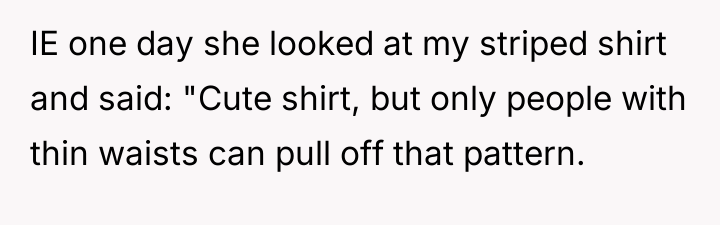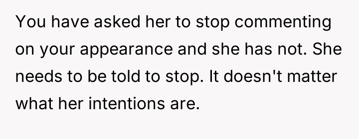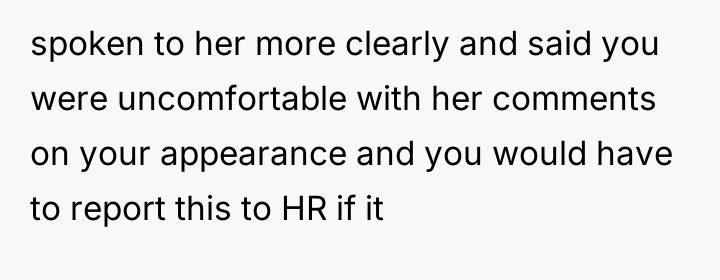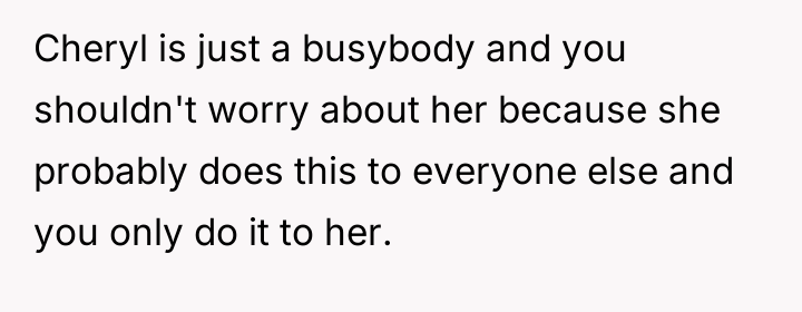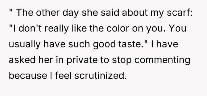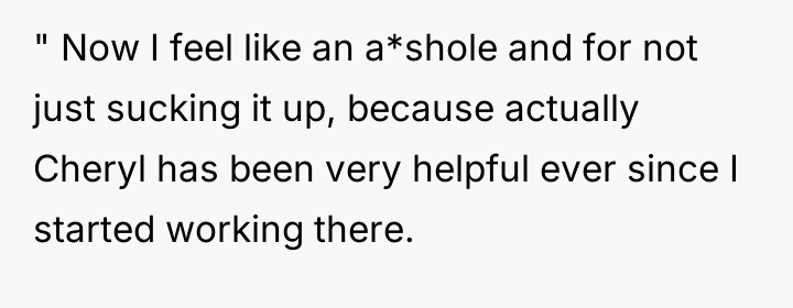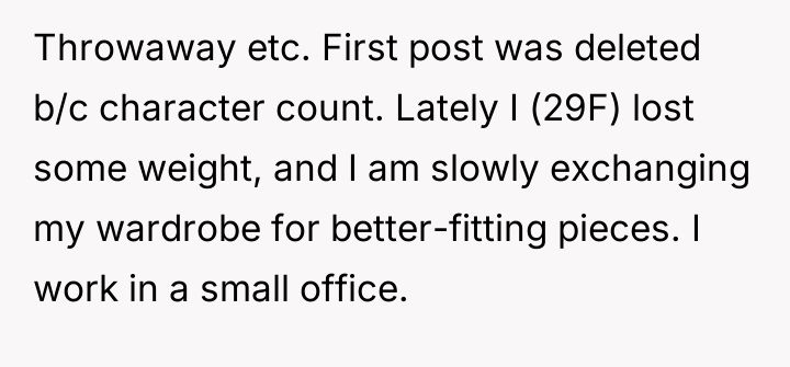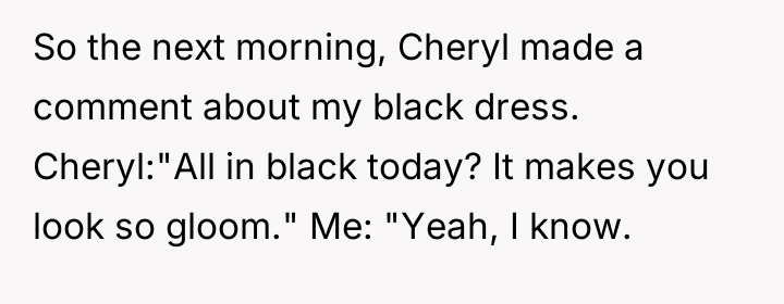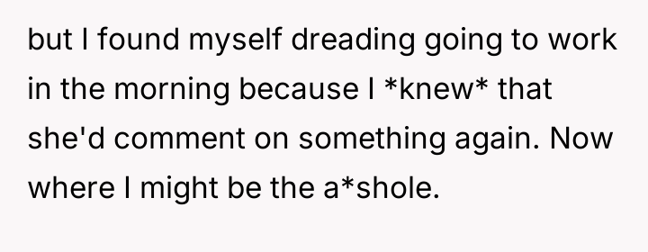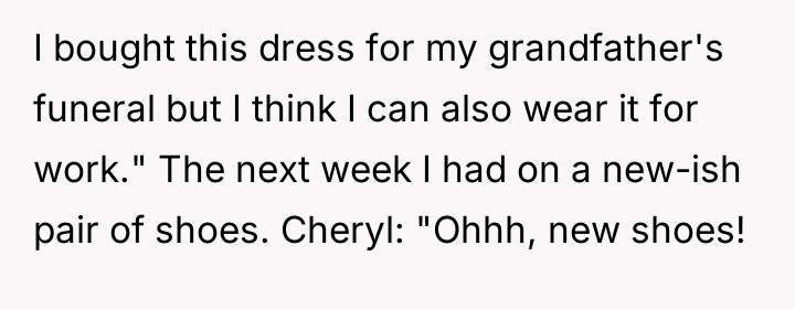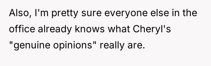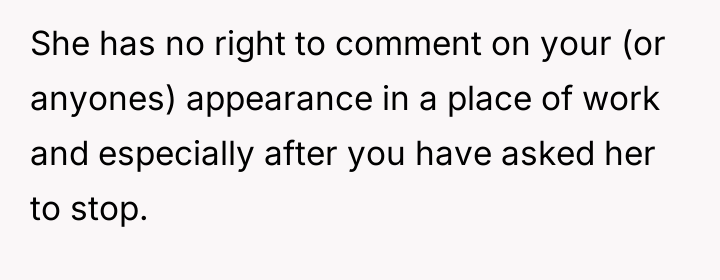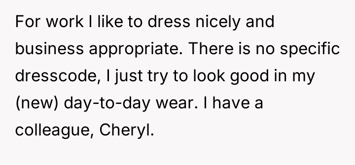In my opinion, the poster is justified in wanting Cheryl to stop making these remarks. Everyone deserves to feel confident and comfortable in their workplace attire without unsolicited critiques, especially when they come from a colleague whose comments feel more like backhanded compliments. Maintaining professionalism and mutual respect at work is key, and the poster’s approach in addressing the issue privately seems like a mature and reasonable step toward fostering a more positive environment.