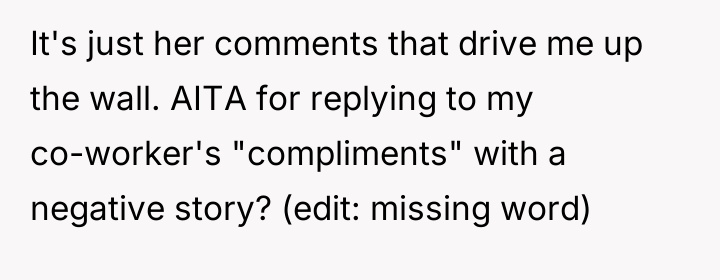 AITA for replying to my co-worker's "compliments" with a negative story?