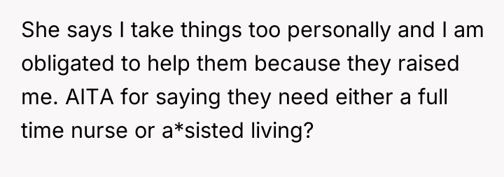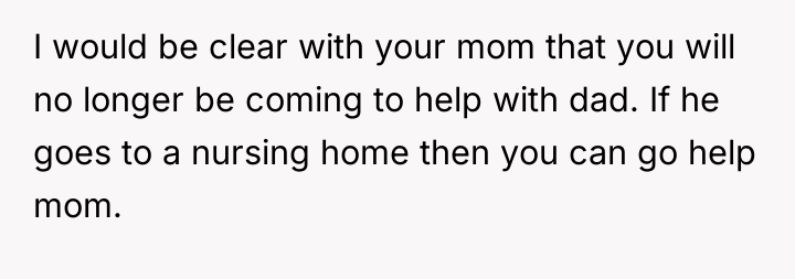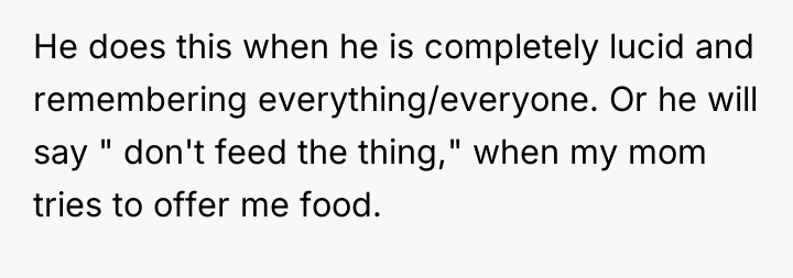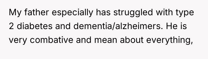 After reading through the Reddit comments, it’s clear that many people empathize deeply with the original poster’s difficult situation. Caring for elderly parents with serious health issues like dementia and diabetes is incredibly challenging, especially when those parents are resistant to help and lash out verbally. Commenters often stress the importance of setting boundaries for one’s own mental health while still striving to provide compassionate care. It seems there’s a shared understanding that the father’s harsh words are a manifestation of his illness rather than a reflection of the daughter’s worth.