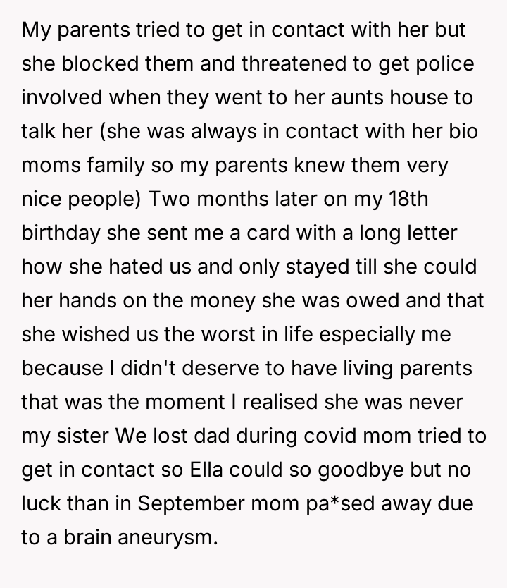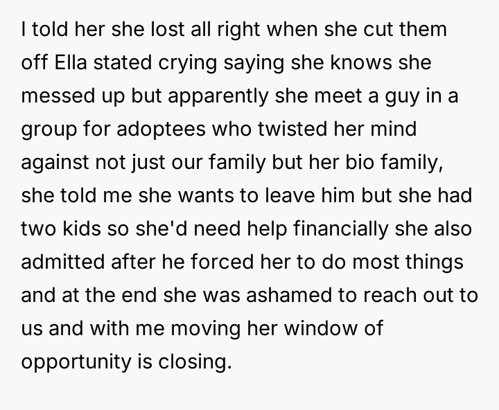 In my opinion, this story highlights how adoption and blended families can sometimes lead to emotional challenges that aren’t easily resolved. While Ella’s actions hurt the family, it’s important to acknowledge her perspective and the pain she may be experiencing. Ultimately, healing might require honest communication and willingness from all parties to understand each other’s feelings. It’s a tough situation, but with time, empathy, and patience, there’s hope for reconciliation.