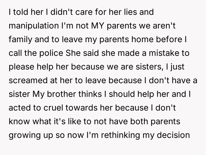 AITAH for telling the girl my parents adopted she has we aren’t family and to leave my parents home