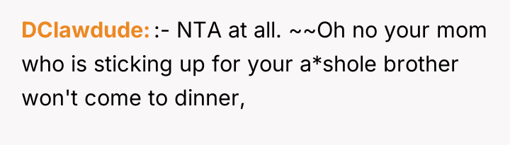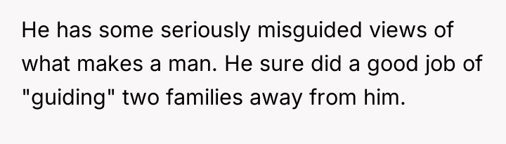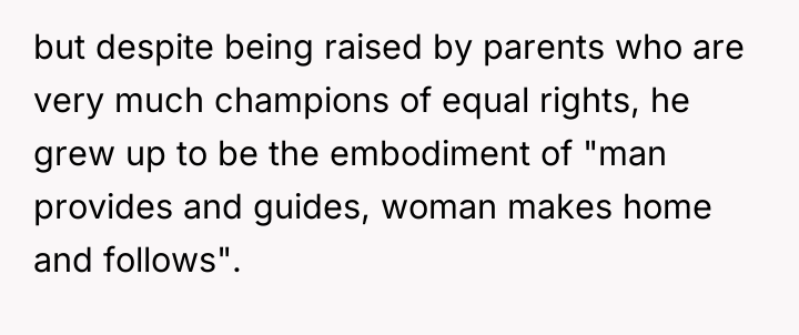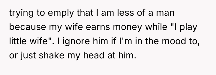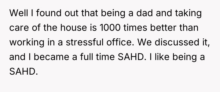 Reading through the Reddit comments, many users expressed admiration for the narrator's decision to prioritize family and personal fulfillment over traditional gender roles. Commenters applauded the positive impact of having a hands-on father and the importance of partnerships that work best for the individuals involved, rather than conforming to societal expectations. Some also sympathized with the brother’s outdated views, noting how rigid mindsets can negatively affect relationships and personal happiness.