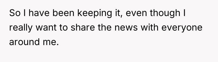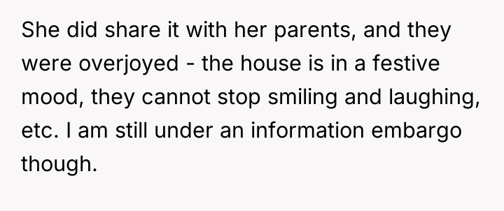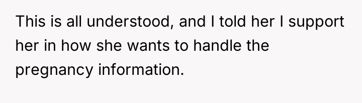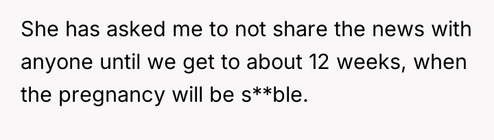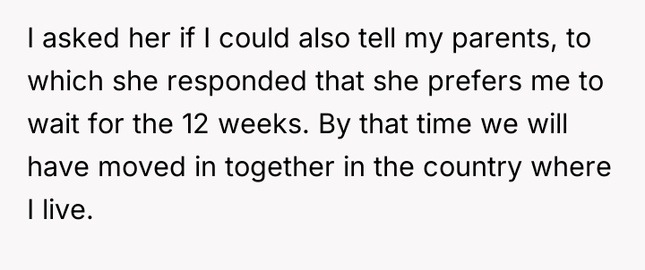 After reading through the Reddit comments, it’s clear that many people empathize with the couple’s situation—balancing excitement with caution is a common experience for first-time parents. Commenters appreciated the wife’s desire to keep the pregnancy private until the 12-week mark, a sensible approach given the risks early in pregnancy. Many also supported the husband’s respect for her wishes, even though he found it difficult not to share the news immediately. The decision to tell her parents first was seen as a thoughtful way to maintain emotional support and create meaningful memories before the big move.