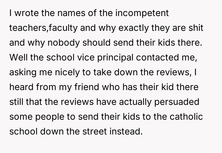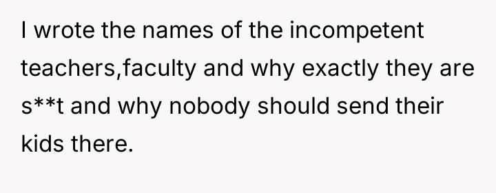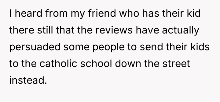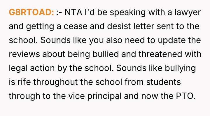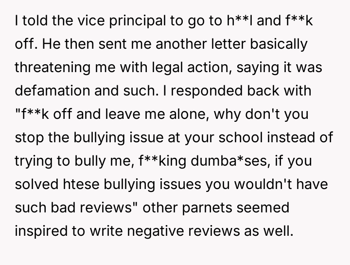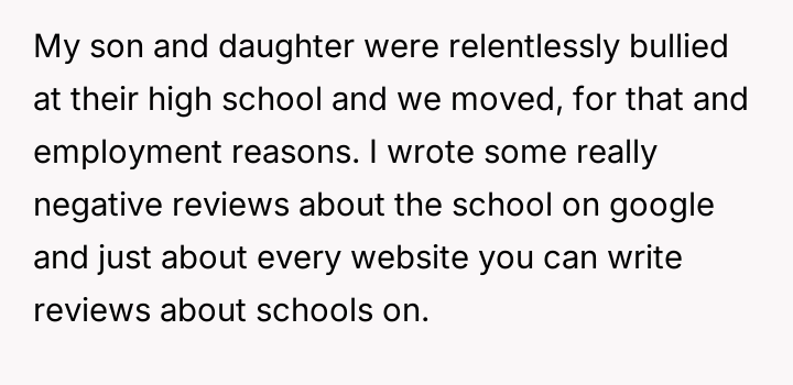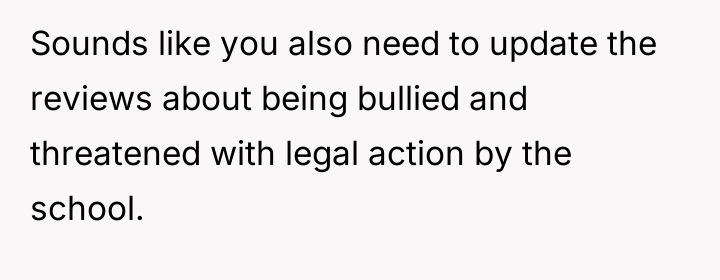 After reading through the Reddit comments, it’s clear that many people empathize deeply with the parent’s frustration and anger. Bullying is a serious issue that schools often fail to address properly, and when parents feel ignored or dismissed, their emotions can boil over into public criticism. Many commenters supported the parent’s stance, emphasizing that honest reviews can help other families make informed decisions about where to send their children, especially when safety and well-being are at stake. Others cautioned the parent to be mindful of legal repercussions, but overall, the sentiment was that the school should focus on fixing the bullying problem rather than threatening legal action.