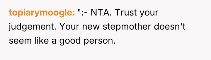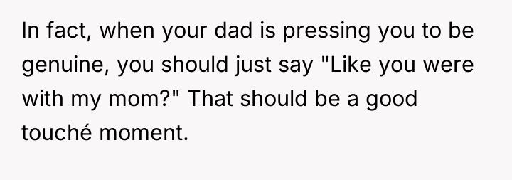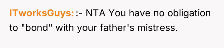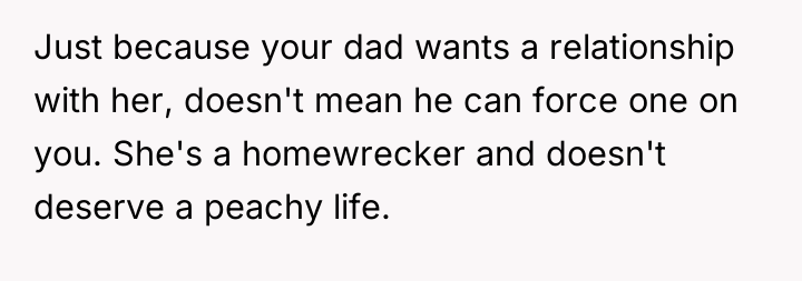 After reading through the Reddit comments, it’s clear that many people empathize deeply with the original poster’s complicated feelings. A lot of readers understand the pain of betrayal and the emotional toll it takes, especially when family dynamics shift so drastically. Many advised staying polite but setting boundaries, focusing on self-care, and recognizing that it’s okay not to force a relationship with the new step-parent. Others also encouraged seeking support, whether through friends, counseling, or trusted adults, to help navigate the difficult emotions and transitions.