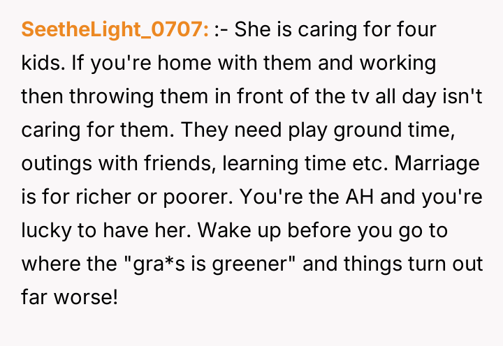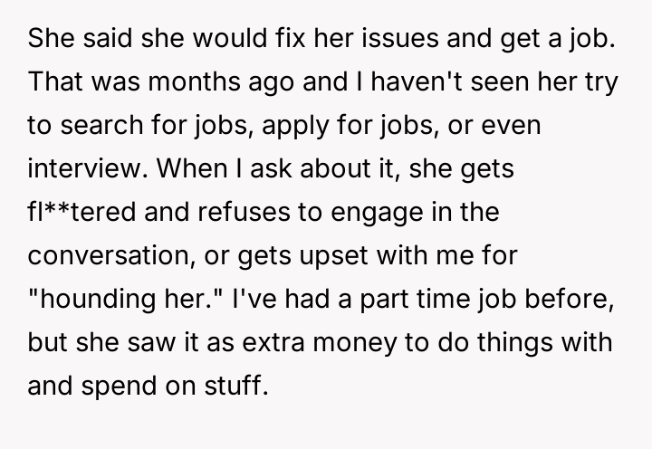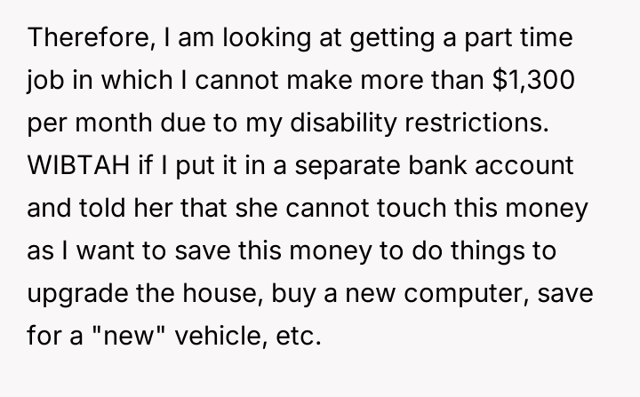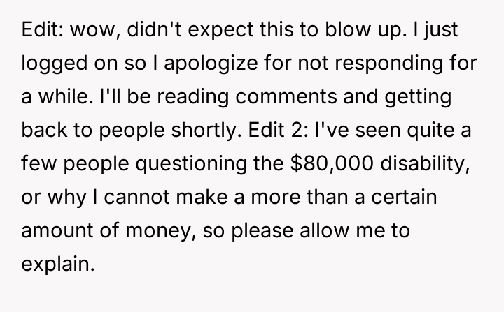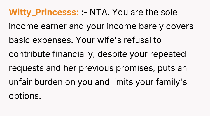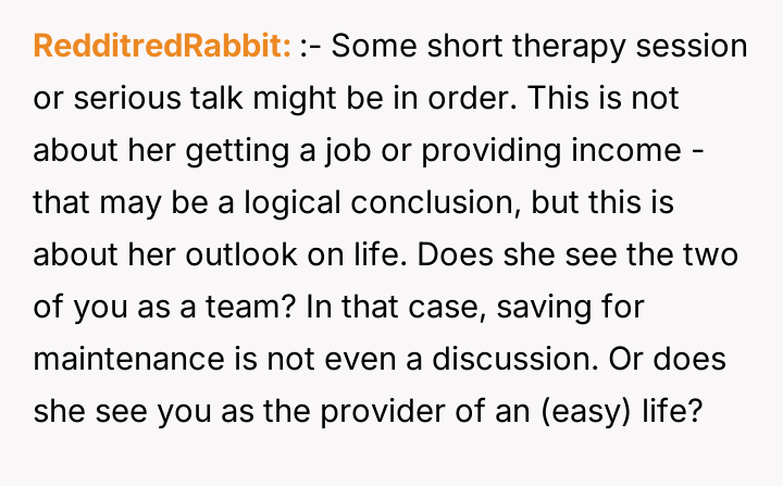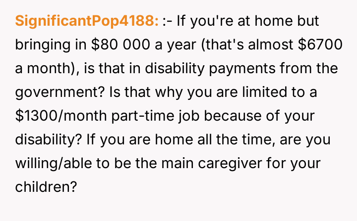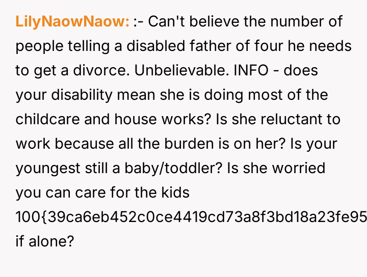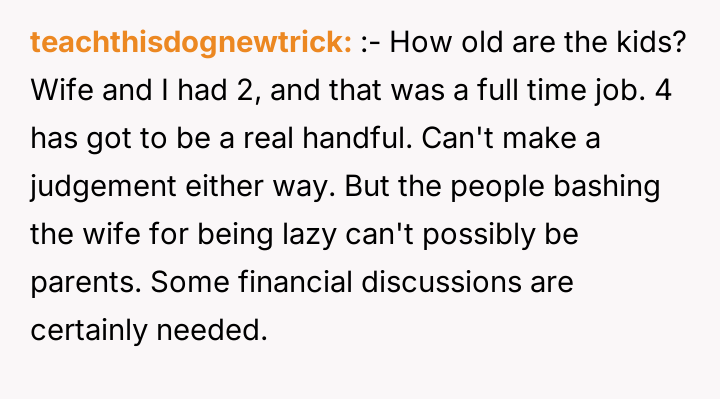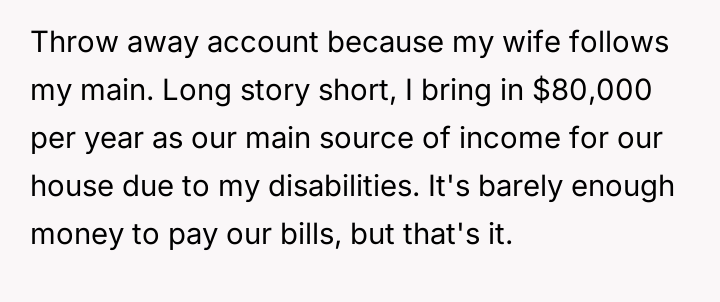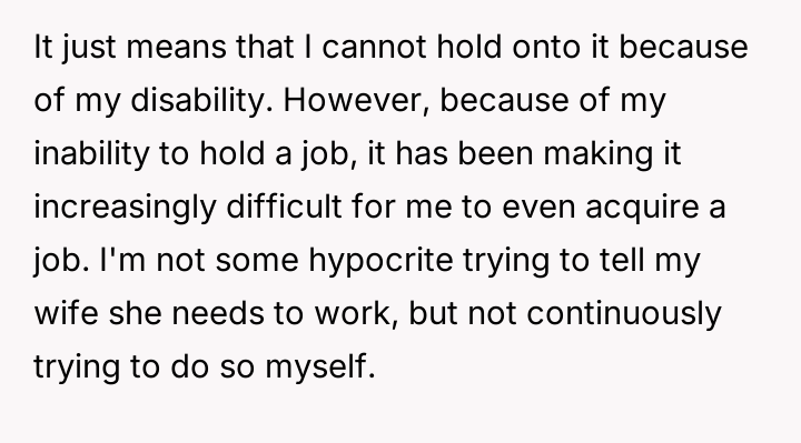 After reading through the Reddit comments, it's clear that many people empathize with the financial strain and emotional frustration the husband is experiencing. The consensus seems to be that a partnership requires effort from both sides, especially when one partner is carrying the financial burden due to disabilities. While some commenters support the wife’s choice to be a stay-at-home mom, they emphasize that open communication and genuine attempts to contribute—whether financially or otherwise—are crucial in maintaining a healthy relationship.