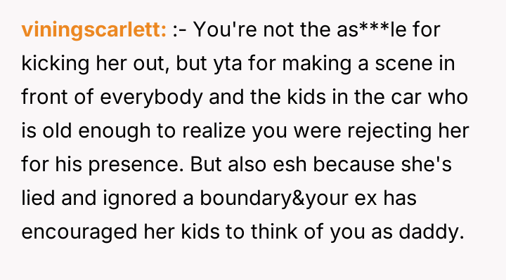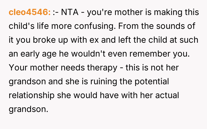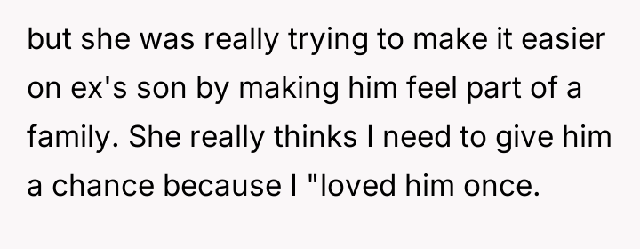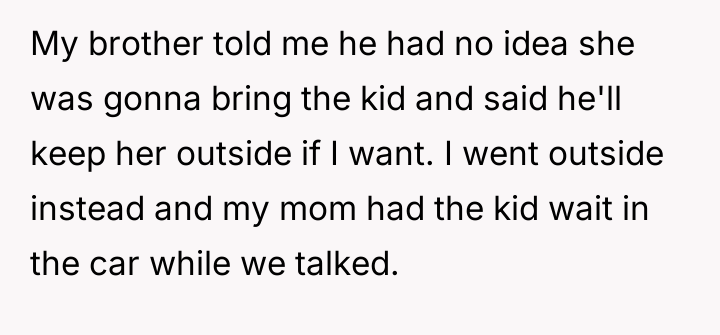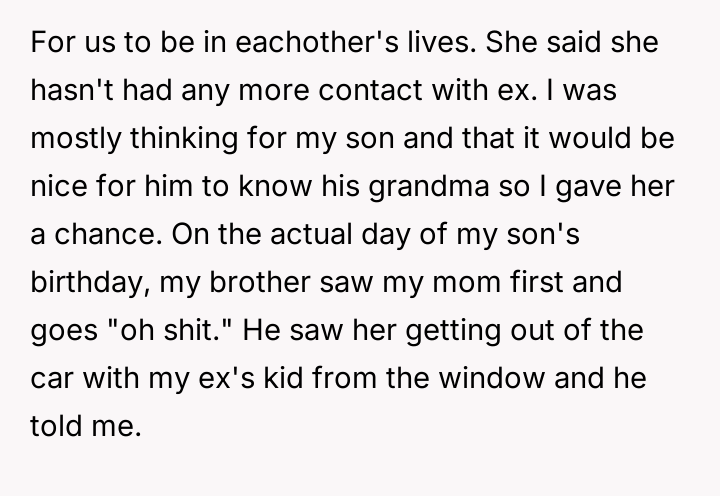 car with a gift for my ex and her son. I was shocked and felt betrayed all over again. It seemed like my mom never really moved on and was still trying to maintain a relationship with the child who isn’t biologically mine. This made me question whether I could truly trust her intentions or if she was undermining the boundaries I set years ago.