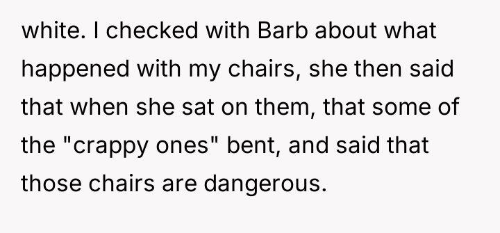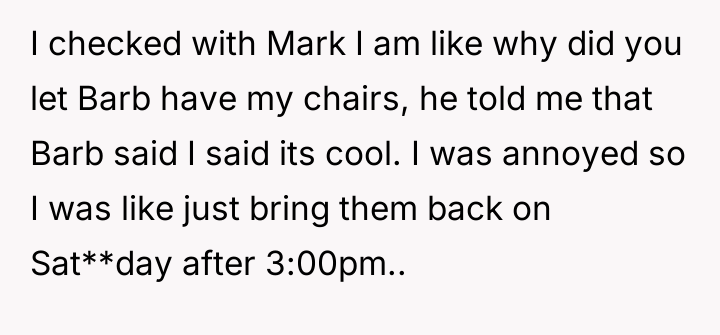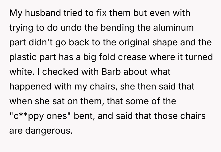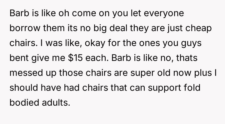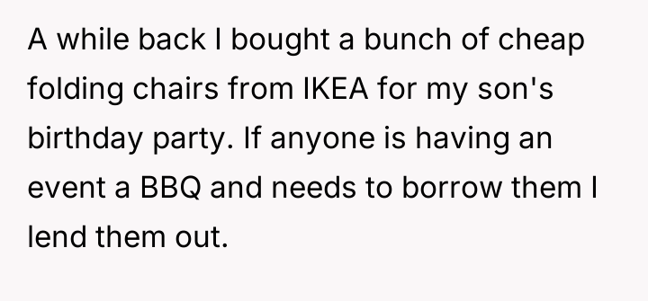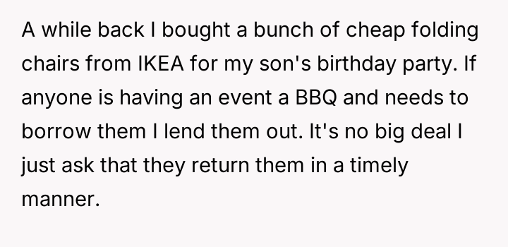 In an act of neighborly kindness, a simple gesture of lending out folding chairs spiraled into a quiet storm of misunderstanding and carelessness. What began as a generous offer to share for a birthday party soon turned into a tangled web of unmet expectations and damaged trust, leaving the owner not only with broken chairs but a deeper sense of frustration and disappointment.
