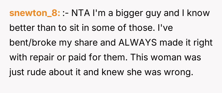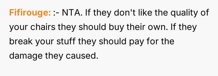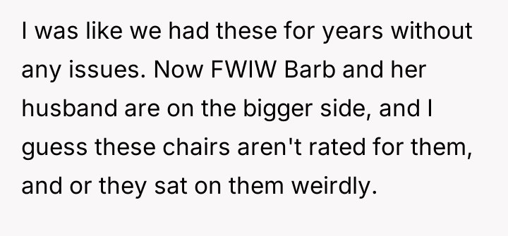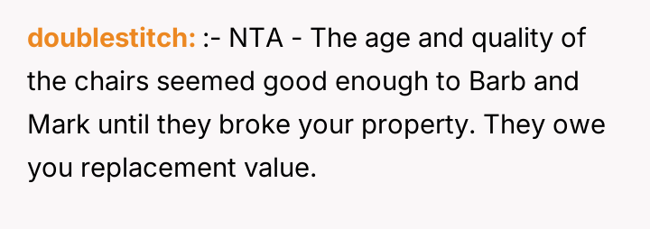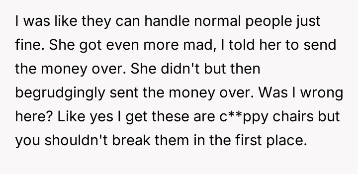 AITA for asking my neighbors to pay me for deforming my cheap IKEA folding chairs and borrowing them without my consent. They claim that the chairs were defective and couldn't support the weight of an adult.