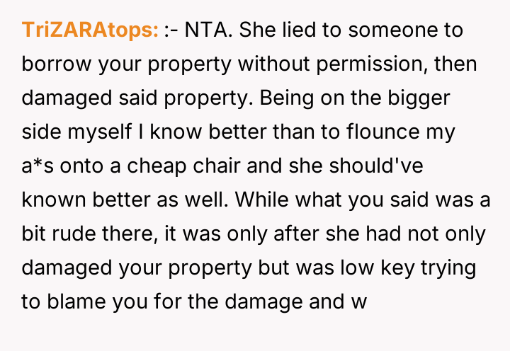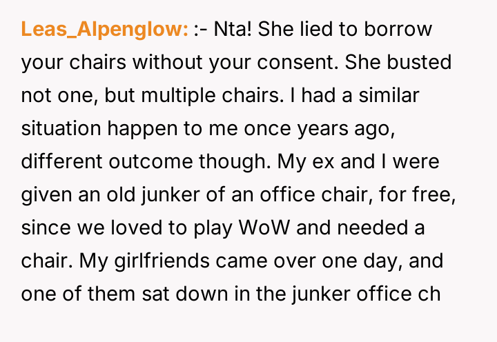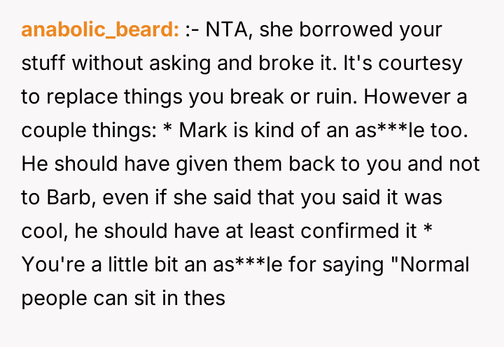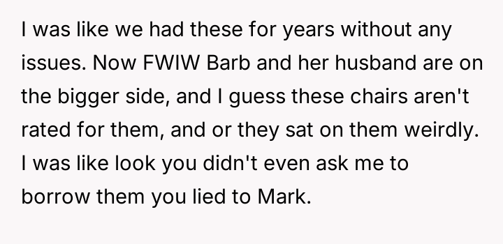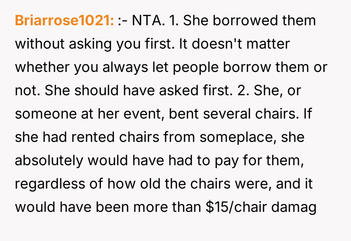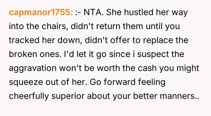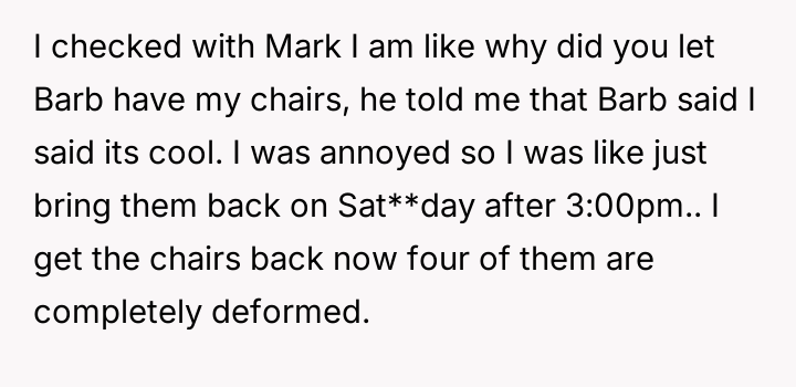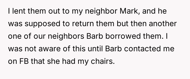 From my perspective, this situation highlights how good intentions can sometimes lead to unexpected complications. While lending items like chairs can foster community spirit, it’s important to establish clear expectations about care and return to prevent damage and disappointment. Hopefully, the neighbors can have an honest conversation to resolve the issue and prevent similar problems going forward.