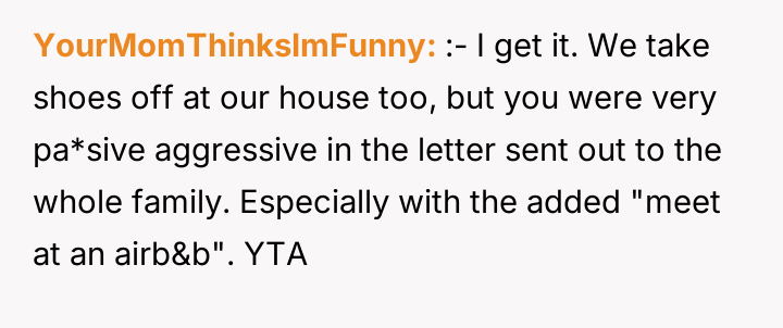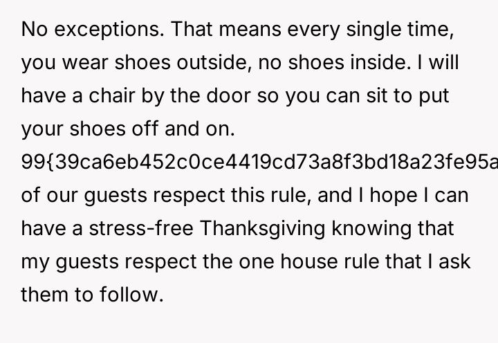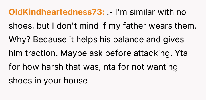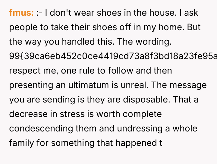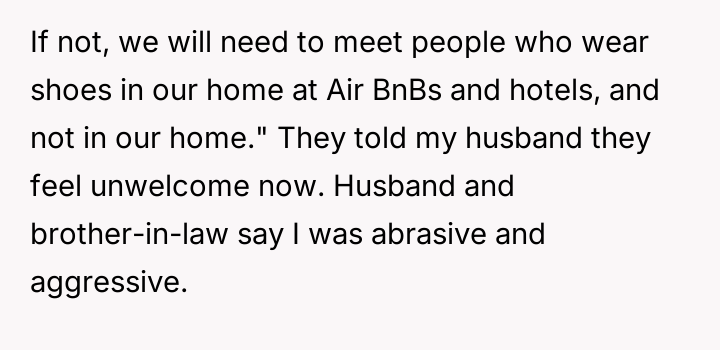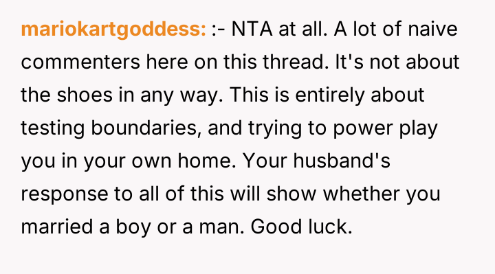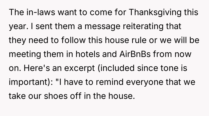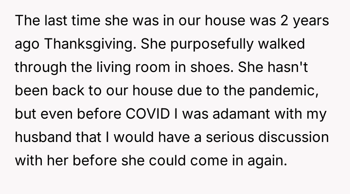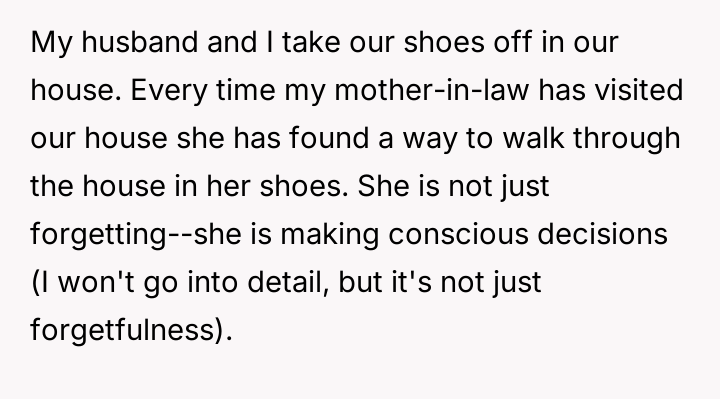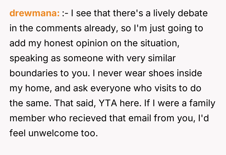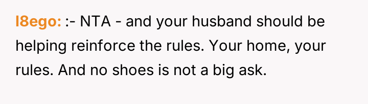 After reading through the Reddit comments, it's clear that many people empathize with the original poster's frustration. The issue of respecting house rules, especially when they are simple and clearly communicated, resonates with a lot of readers. Most commenters agree that the mother-in-law's repeated disregard for the no-shoes policy is not only disrespectful but also selfish, and that setting firm boundaries is necessary to maintain harmony and cleanliness in the home.