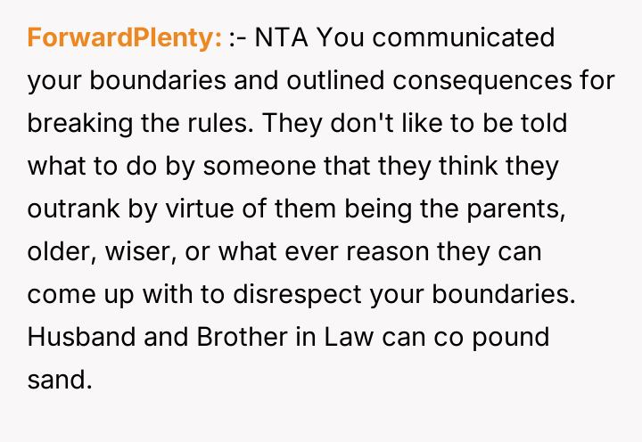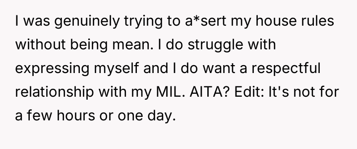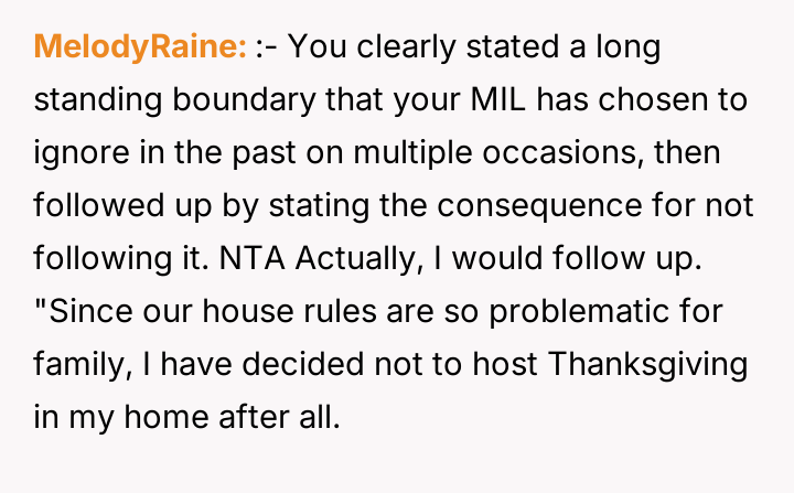 In my opinion, the original poster handled the situation with the right mix of firmness and clarity. House rules exist for a reason, and expecting guests, especially family, to follow them is reasonable. If the mother-in-law cannot respect these boundaries, then it’s perfectly fair to suggest alternative arrangements like staying at a hotel. It’s important to prioritize one’s own comfort and home environment, even if it means making tough decisions during family gatherings.