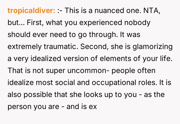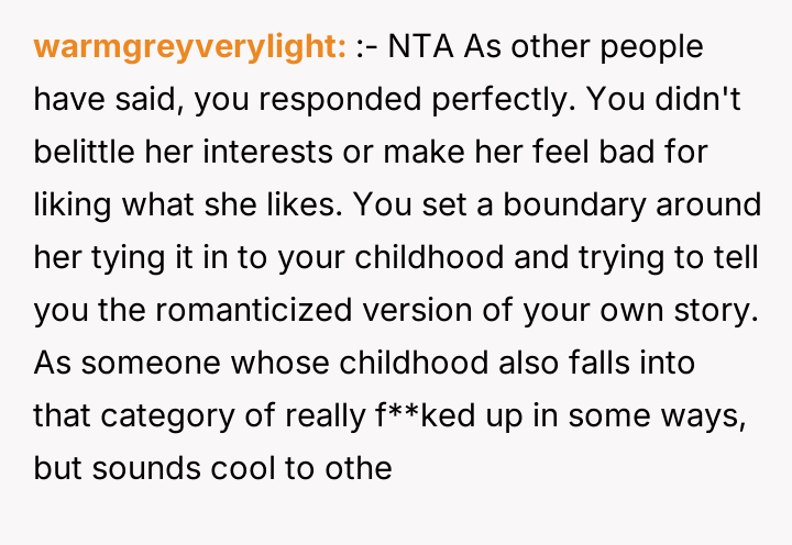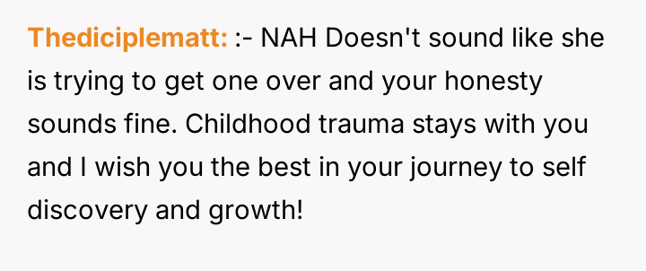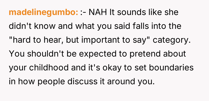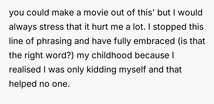 In my opinion, embracing the full reality of one’s childhood—both the pain and the resilience it forged—is a crucial step toward healing. OP’s journey from denial to acceptance is a powerful reminder that acknowledging hardship doesn’t diminish one’s story but rather adds depth and authenticity. It’s inspiring to see her courage in sharing such a difficult experience and choosing to own her narrative on her own terms.