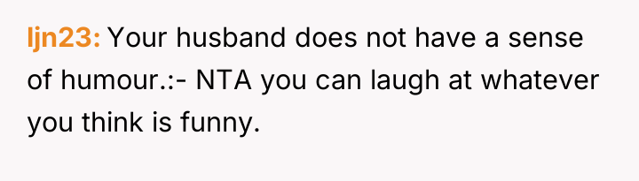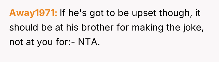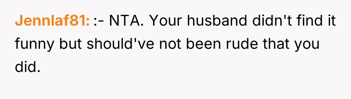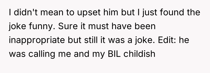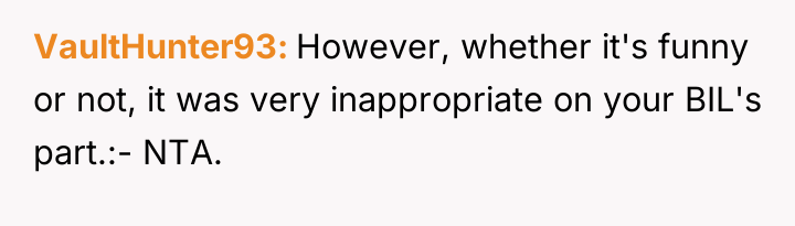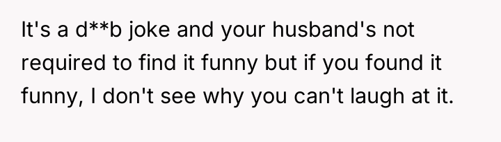 Reading through the Reddit comments, it's clear that many found the brother-in-law's joke immature but harmless, and some even sympathized with the original poster for finding humor in the moment. Others understood the husband's reaction, seeing the comment as crossing a line of appropriateness, especially given the family dynamics. Overall, it seems the consensus is that while humor can be subjective, sensitivity to others' feelings in shared spaces is important.