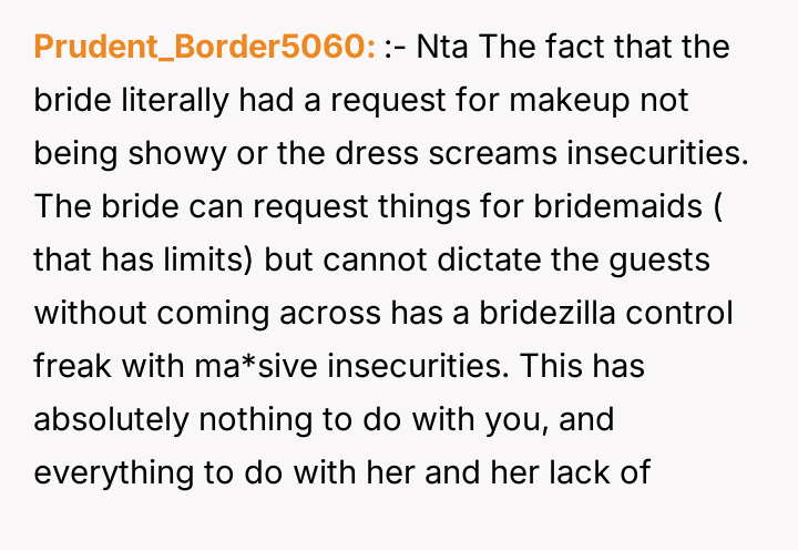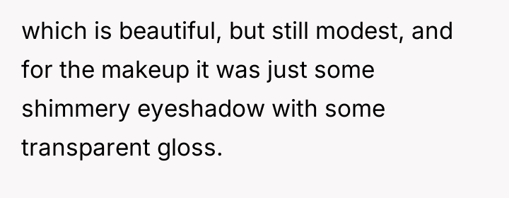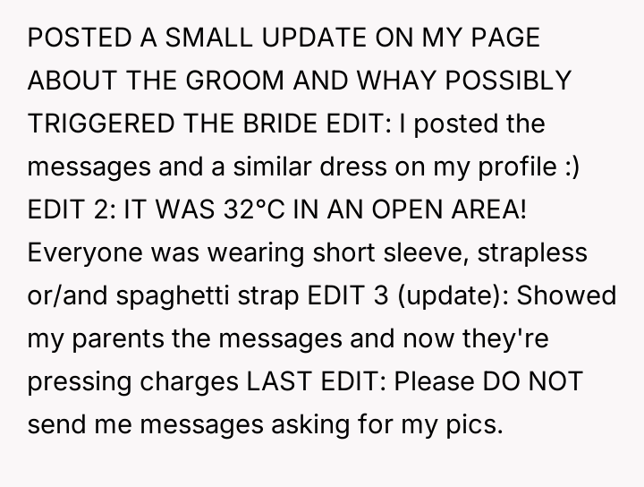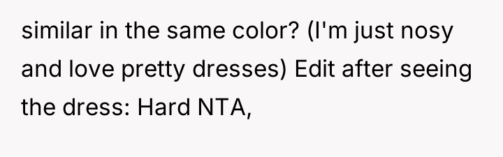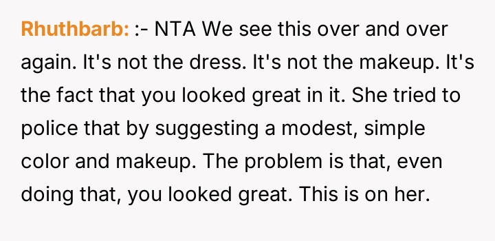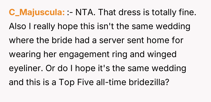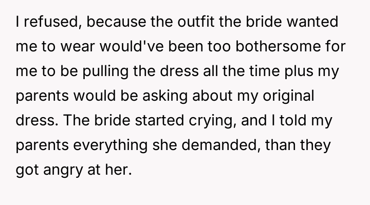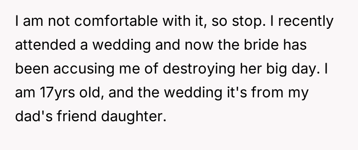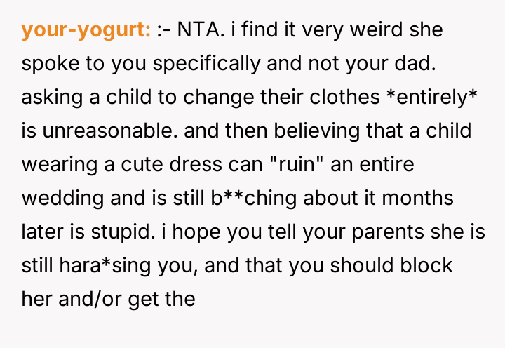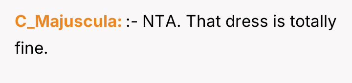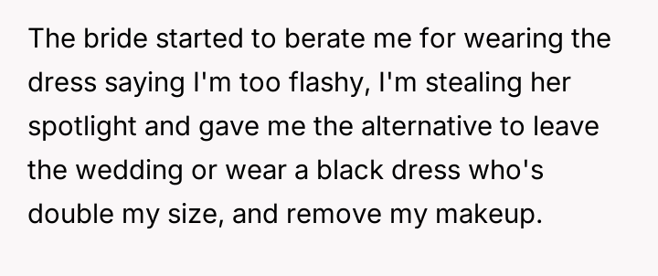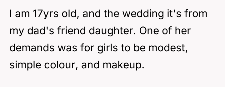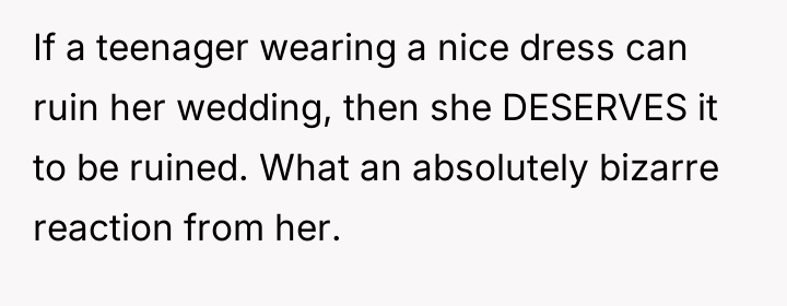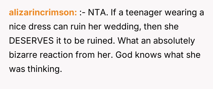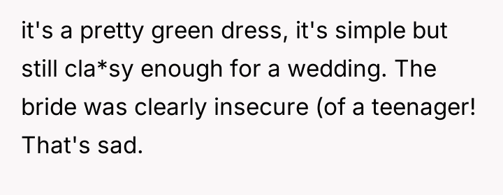 After reading through the Reddit comments, it's clear that many people sympathize with the 17-year-old for trying to respect the bride's wishes while still feeling comfortable in her own outfit. Several commenters pointed out that the dress seemed modest and appropriate, especially considering the hot weather and the general attire of other guests. The bride's extreme reaction and accusations appear to be disproportionate, especially since the young girl tried to follow the guidelines but was still singled out unfairly.