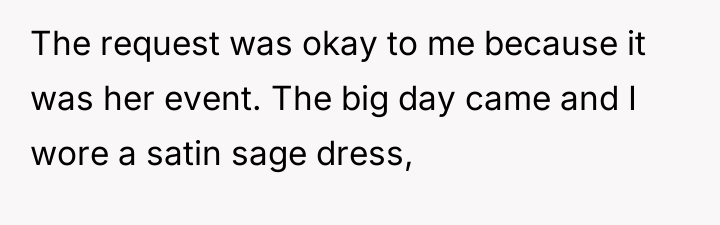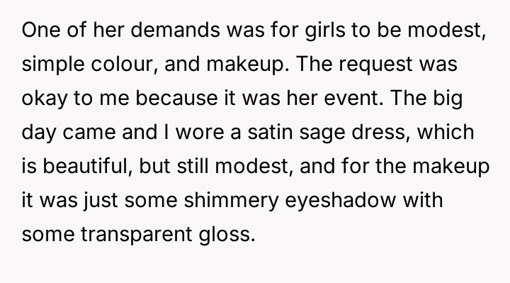 At just 17, she stepped into a world of adult expectations, trying her best to honor the bride’s wishes with a modest satin sage dress and subtle makeup. What should have been a celebration of love quickly spiraled into accusations, as the bride’s day unraveled around her presence, leaving her bewildered and hurt.