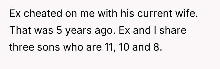 Amid the echoes of hurt and the sting of an uninvited stepmother’s presence, she stands resilient—grieving what was lost yet refusing to be defined by the betrayal. Her focus remains on shielding her three sons from the chaos, striving to rebuild their world with strength and grace, even as the shadows of infidelity cast long, painful memories over their fractured family.