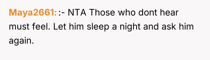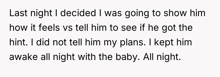 In the end, this story underscores the importance of empathy and partnership in parenting. Both parents need to support each other, especially when one is carrying the bulk of the nighttime responsibility. While the mother’s tactic might have been a wake-up call, a more constructive approach would involve honest dialogue and compromise. Hopefully, this couple can find a way to work together, balancing childcare and rest so that both feel valued and supported during this challenging phase of life.