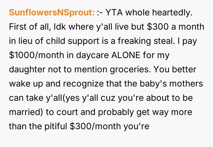 In my opinion, while it’s admirable that the fiancé wants to be a responsible father, it’s equally important for both partners to feel secure and respected in their relationship. Finding a compromise—such as gradually transitioning the financial support or exploring other housing options—might be the best path forward. Ultimately, addressing this issue before marriage is crucial, as financial and emotional transparency lays the foundation for a healthy partnership.