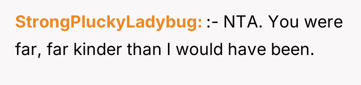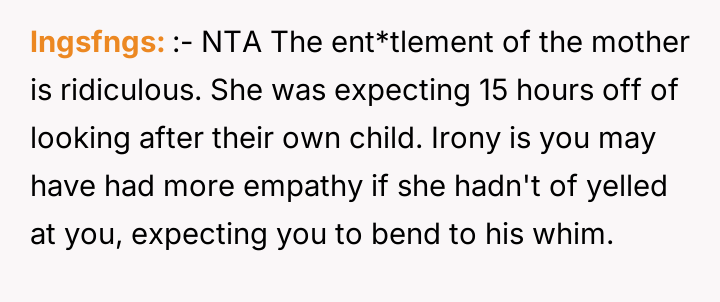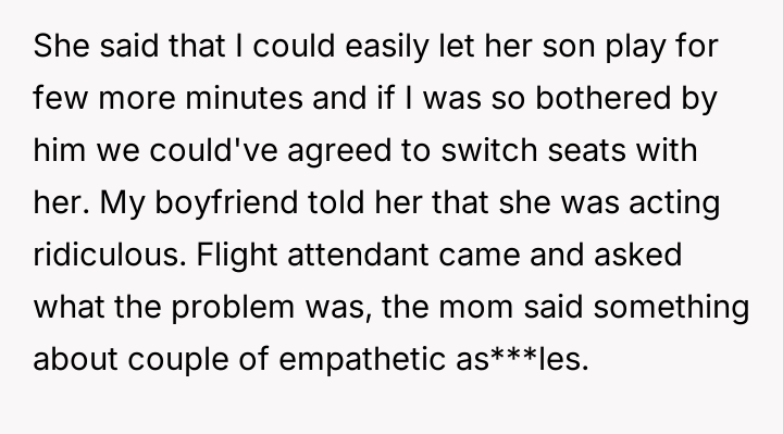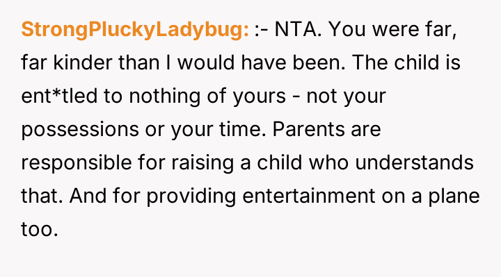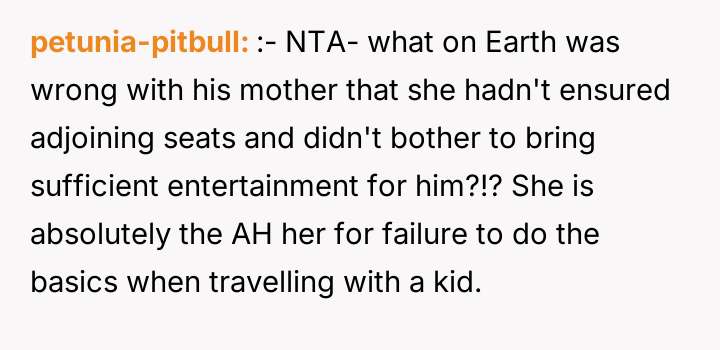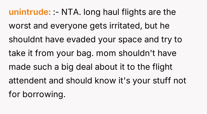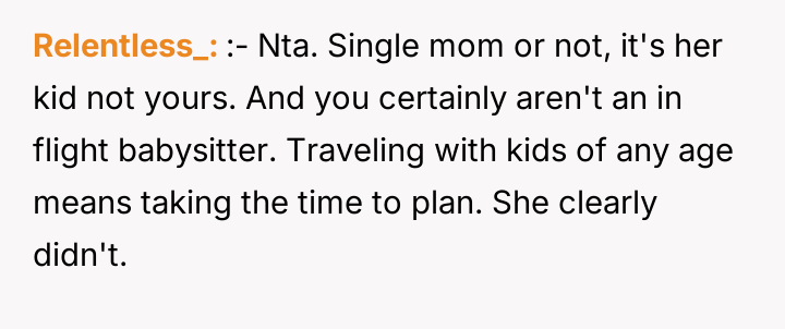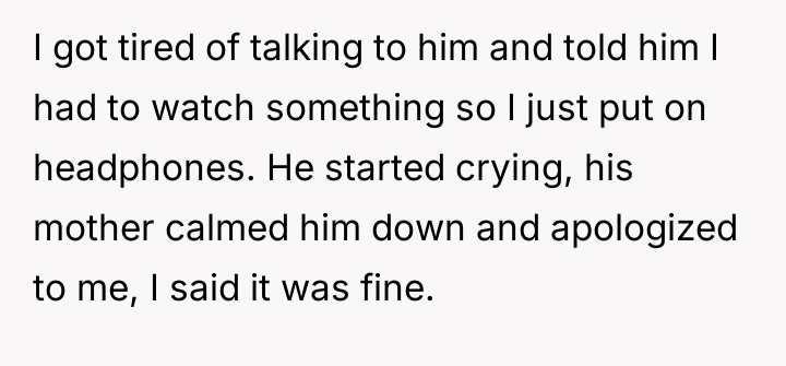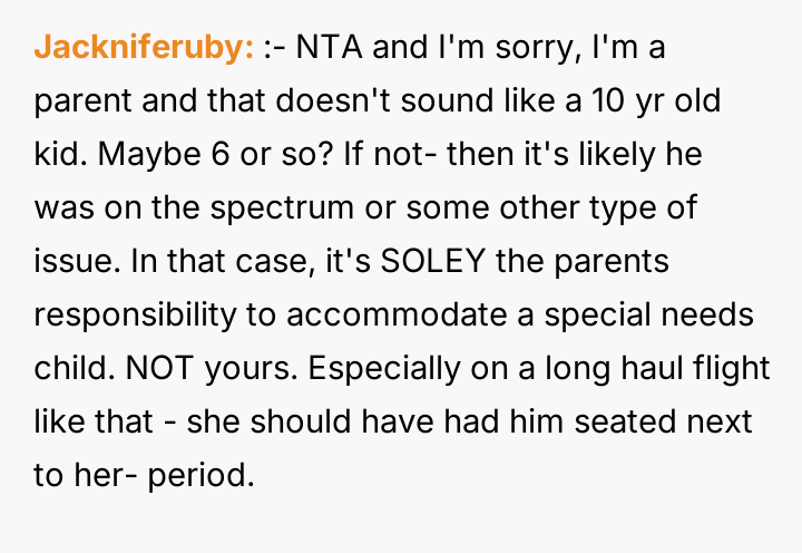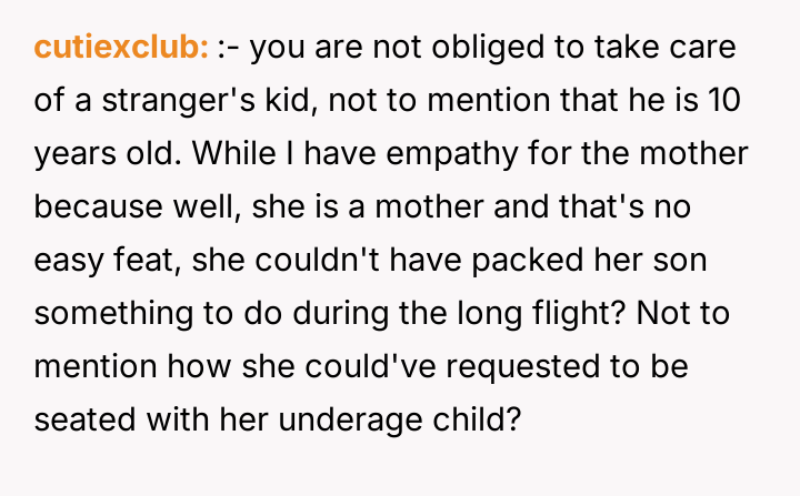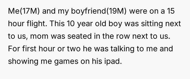 After reading through the Reddit comments, it’s clear that opinions are mixed but tend to lean toward understanding the teenager’s perspective. Many commenters sympathized with the 17-year-old who was put in an awkward position—trying to be polite yet wanting to enjoy his own flight without being responsible for a child’s entertainment. The boy’s repeated crying was unfortunate, but it’s important to remember that the young man wasn’t obligated to entertain a stranger for 15 hours straight, and setting boundaries is reasonable, especially when dealing with a long and tiring trip.