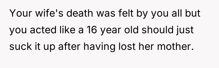reading through the Reddit comments and noticed many readers empathized deeply with the father's struggle, acknowledging the immense pressure he was under while mourning and trying to keep the family afloat. Many expressed sympathy for Nancy, recognizing how much she sacrificed and how hurt she must have felt when her prom was overlooked. The consensus seemed to be that while the father’s intentions weren’t malicious, his exhaustion and grief caused him to miss important emotional moments for his daughter.