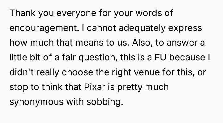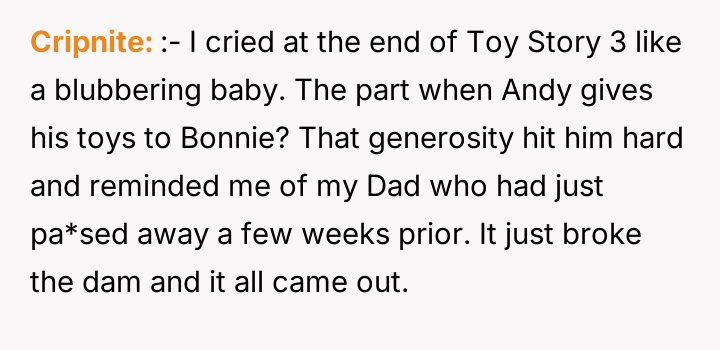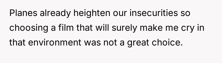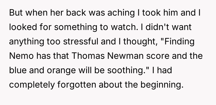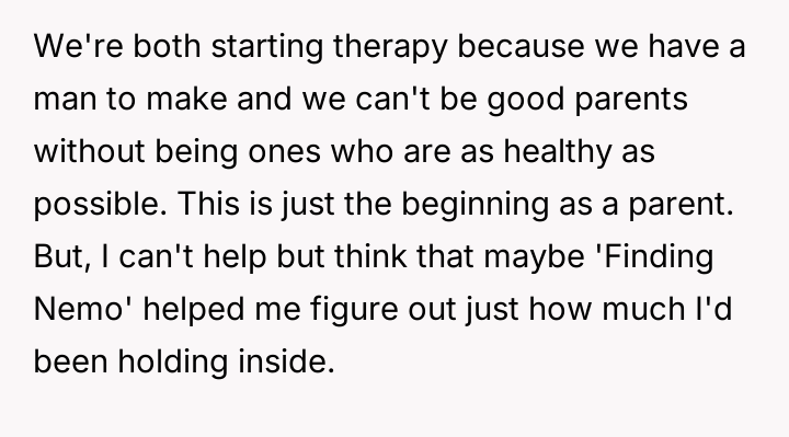 TIFU: My wife nearly died during the birth of my son three months ago. He was born very premature and he’s had some physical challenges. We took him on his first flight and he was really well behaved. What did I choose to watch? Finding Nemo. Very, very stupid choice.