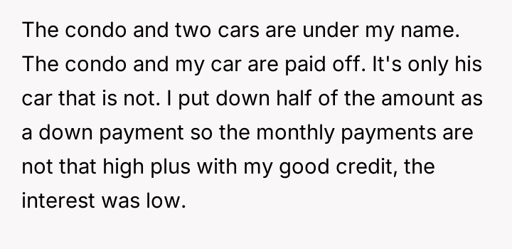 Beneath the surface of their steady relationship lay fragile truths tied to money, ownership, and expectations. The condo and cars under her name symbolized not just a*sets, but the silent burden she carried, hoping to protect their family while grappling with the fear that the foundation they built might not be as solid as she believed.